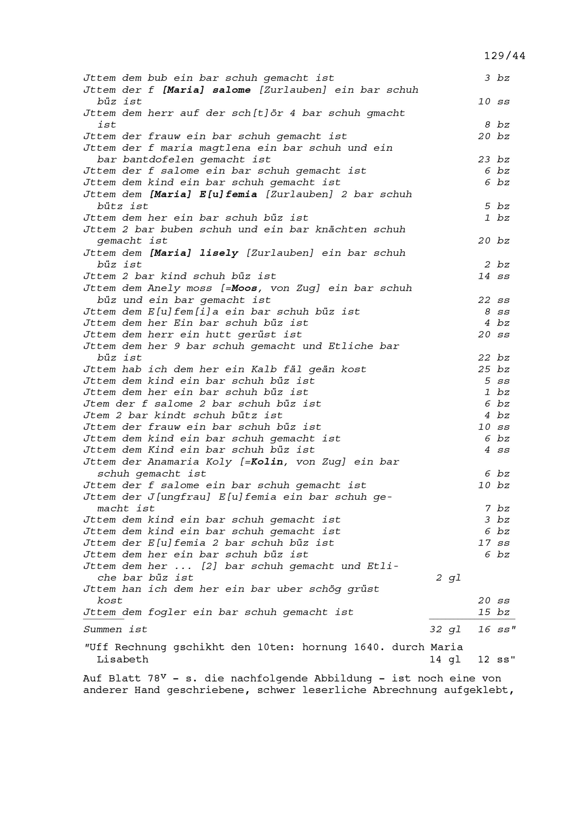 Rechnung für Beat II. Zurlauben, Altammann und Stadt- und Amtrat Zug, ausgestellt von Oswald Weber, Zuger Schuhmacher