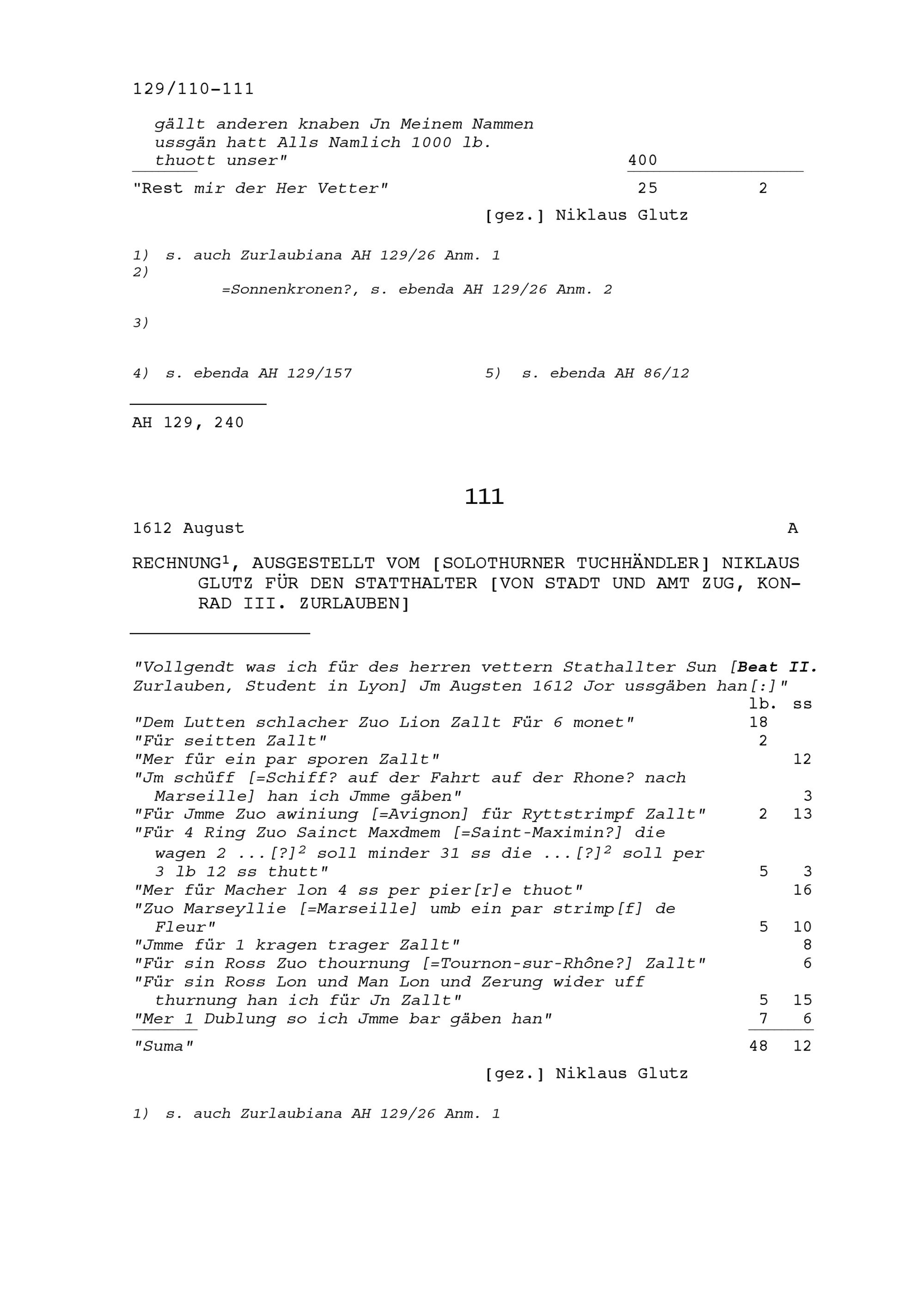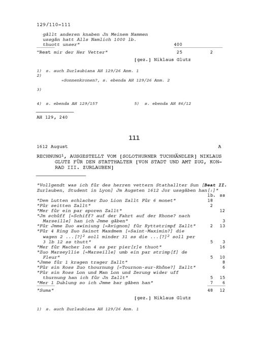 Rechnung für Konrad III. Zurlauben, Statthalter von Stadt und Amt Zug, ausgestellt von Niklaus Glutz, Solothurner Tuchhändler