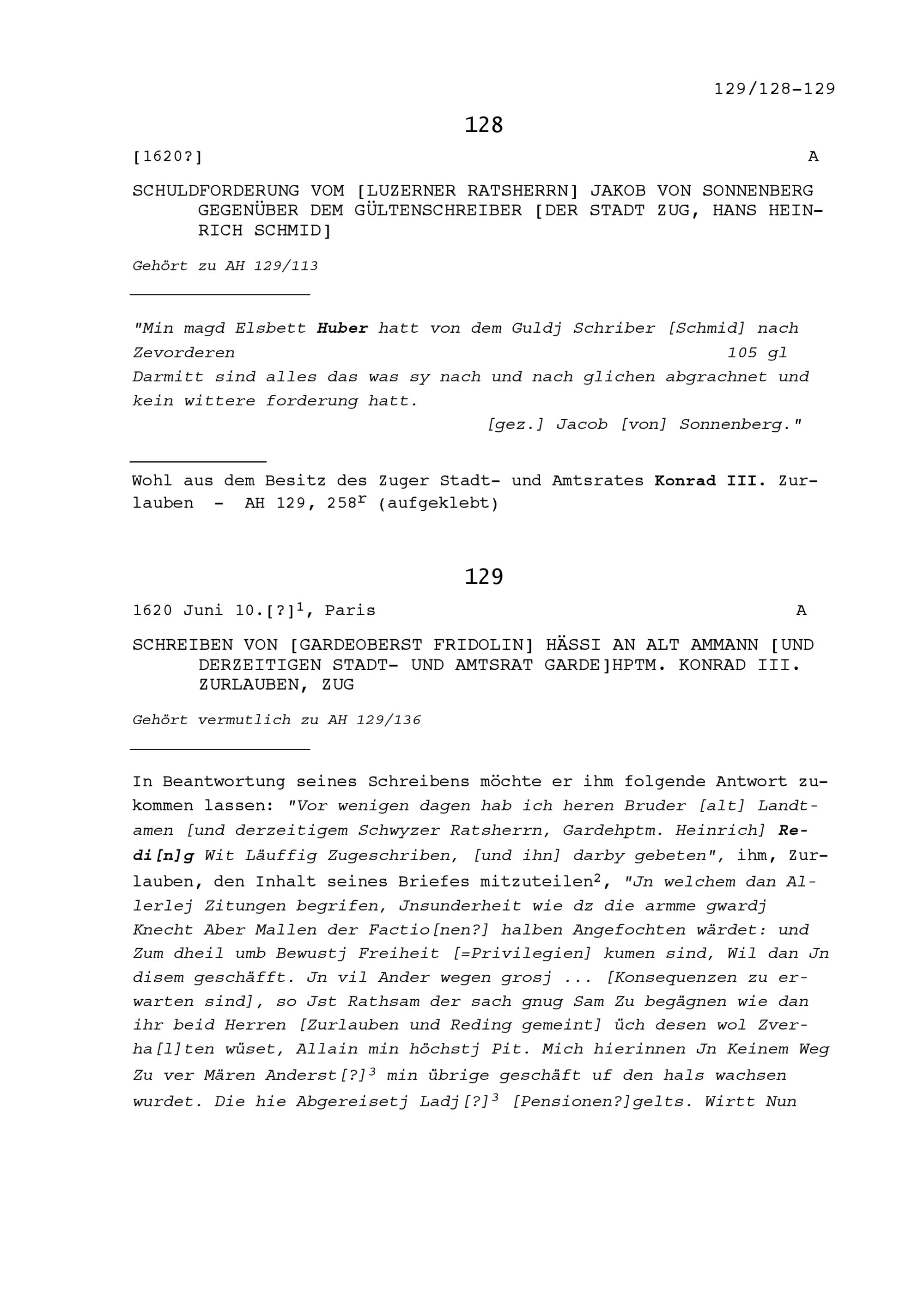 Schuldforderung von Jakob von Sonnenberg, Luzerner Ratsherr, gegenüber Hans Heinrich Schmid, Gültenschreiber der Stadt Zug