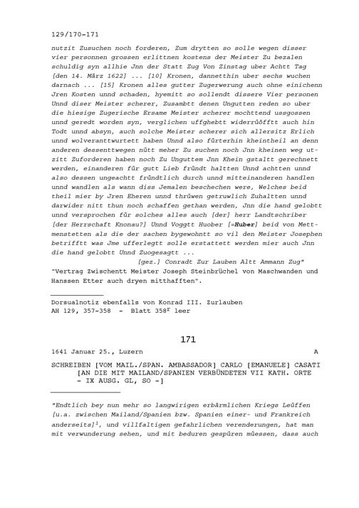 Schreiben von Karl Emanuele Casati, Ambassador von Mailand-Spanien, an die mit Mailand-Spanien verbündeten Sieben Katholischen Orte
