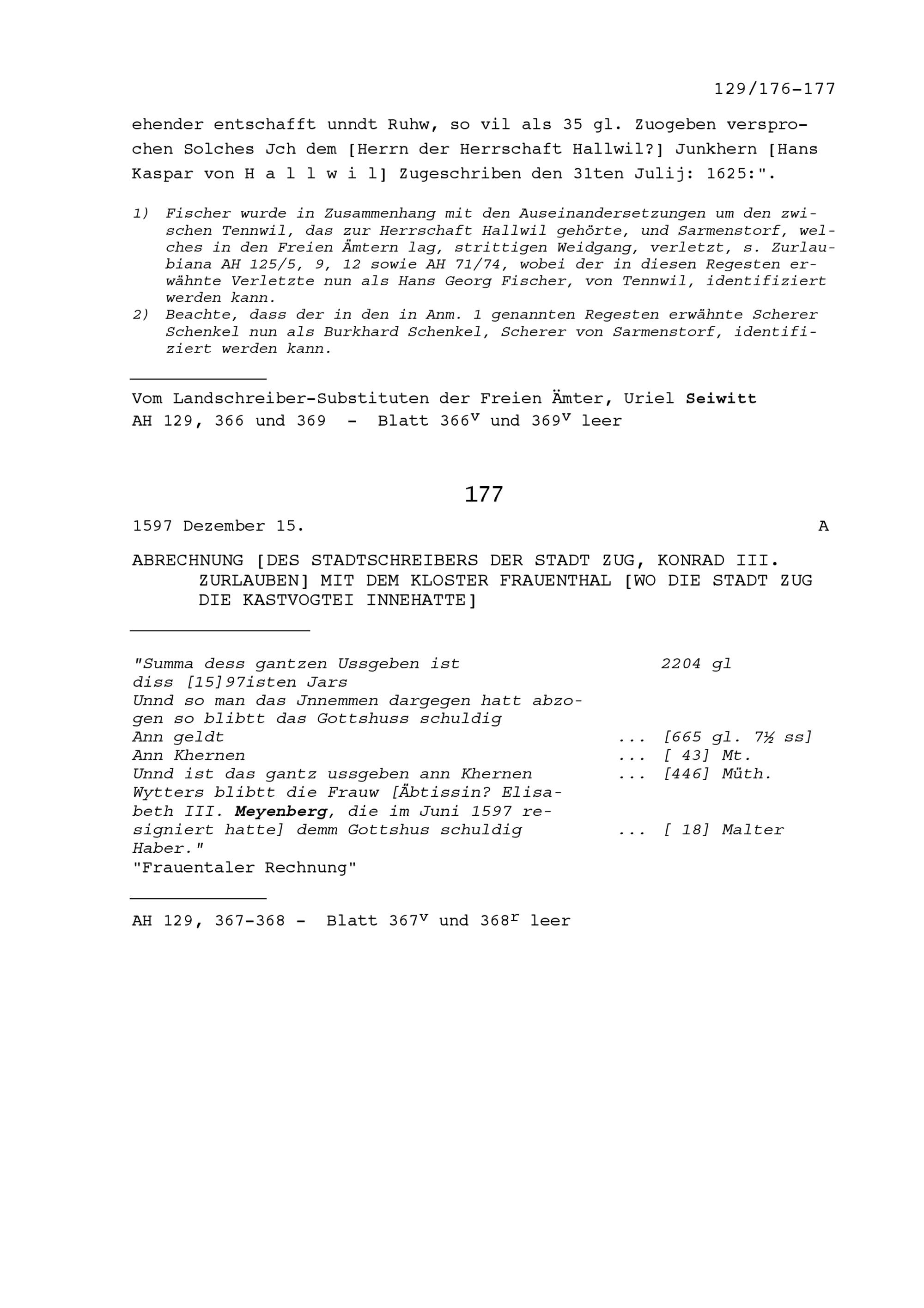 Abrechnung von Konrad III. Zurlauben, Stadtschreiber von Zug, mit dem Frauenkloster Frauenthal