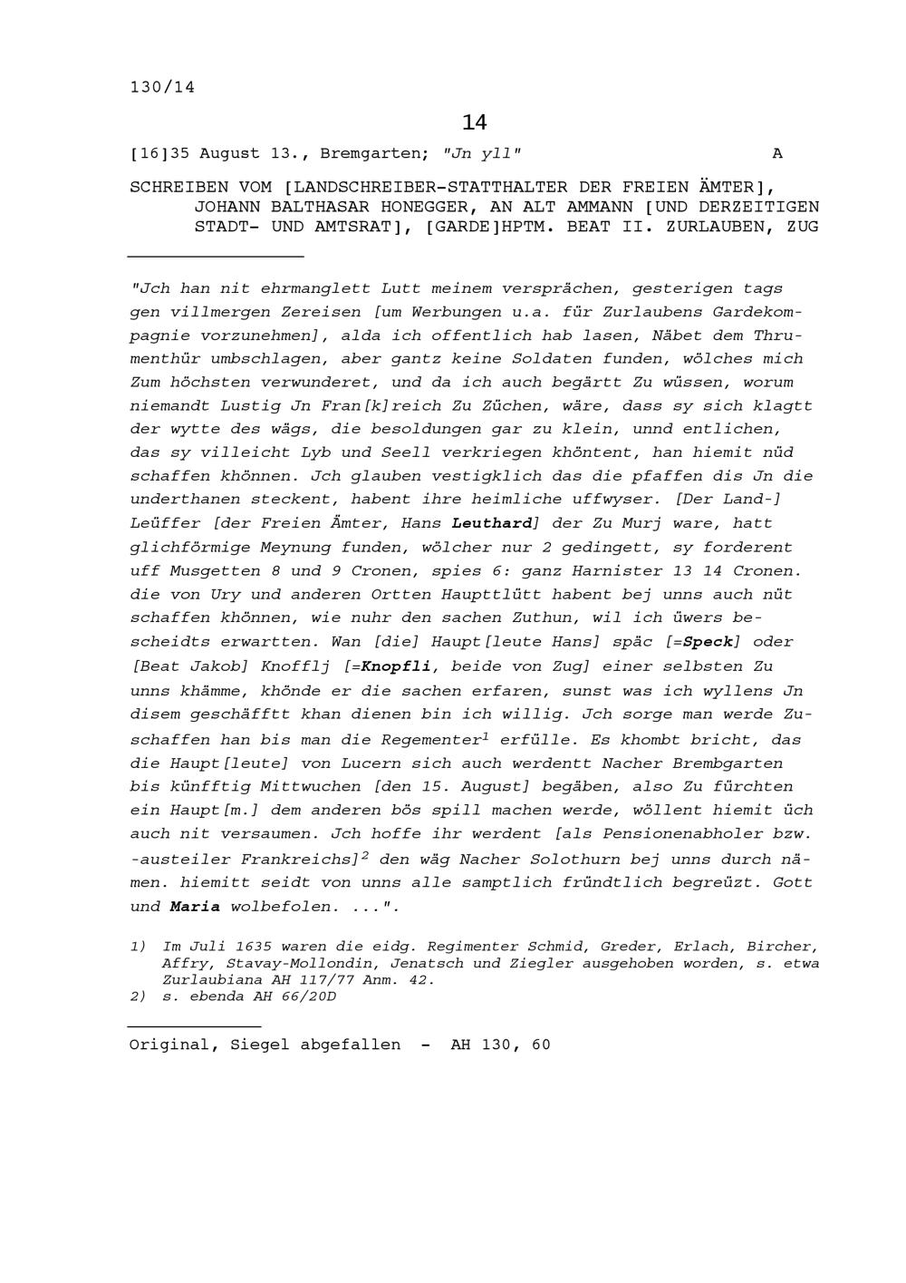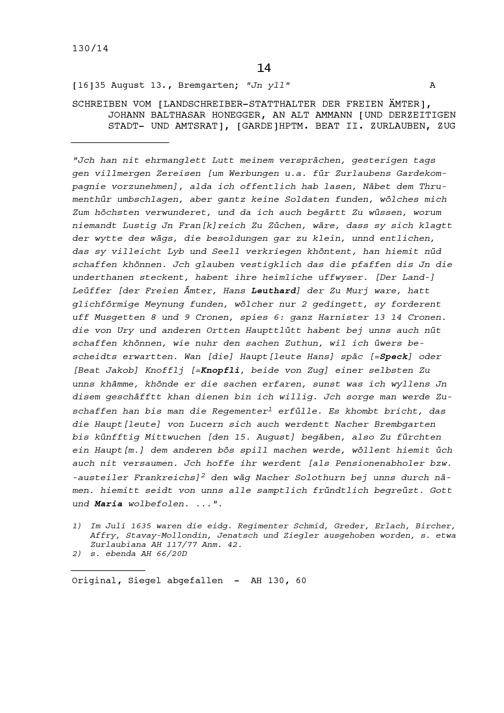 Schreiben von Johann Balthasar Honegger, Landschreiberstatthalter der Freien Ämter, an Beat II. Zurlauben, Gardehauptmann, Altammann und Stadt- und Amtrat, Zug