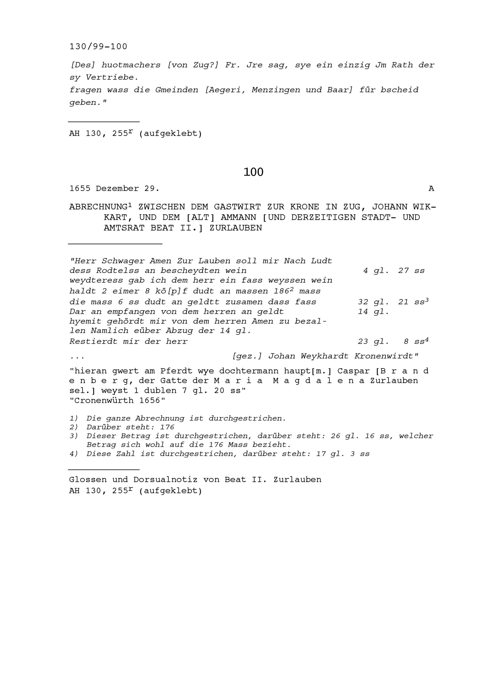 Abrechnung zwischen Johann Wickart, Gastwirt zur Krone in Zug, und Beat II. Zurlauben, Altammann und Stadt- und Amtrat