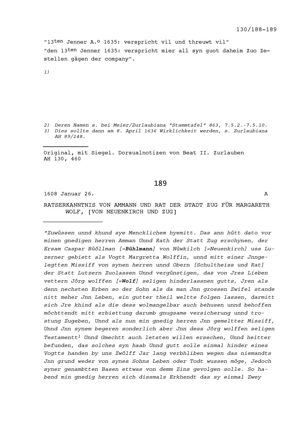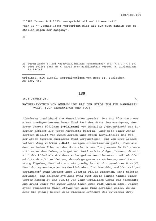 Ratsbeschluss des Ammanns und Rats der Stadt Zug für Margareth Wolf, von Neuenkirch und Zug