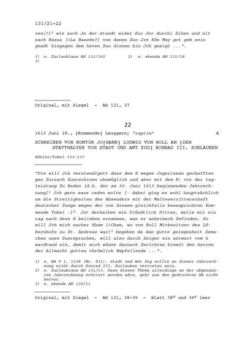 Schreiben von Johann Ludwig von Roll, Komtur, an Konrad III. Zurlauben, Statthalter von Stadt und Amt Zug