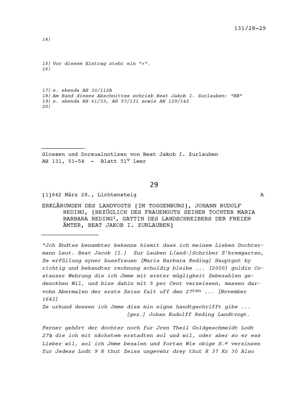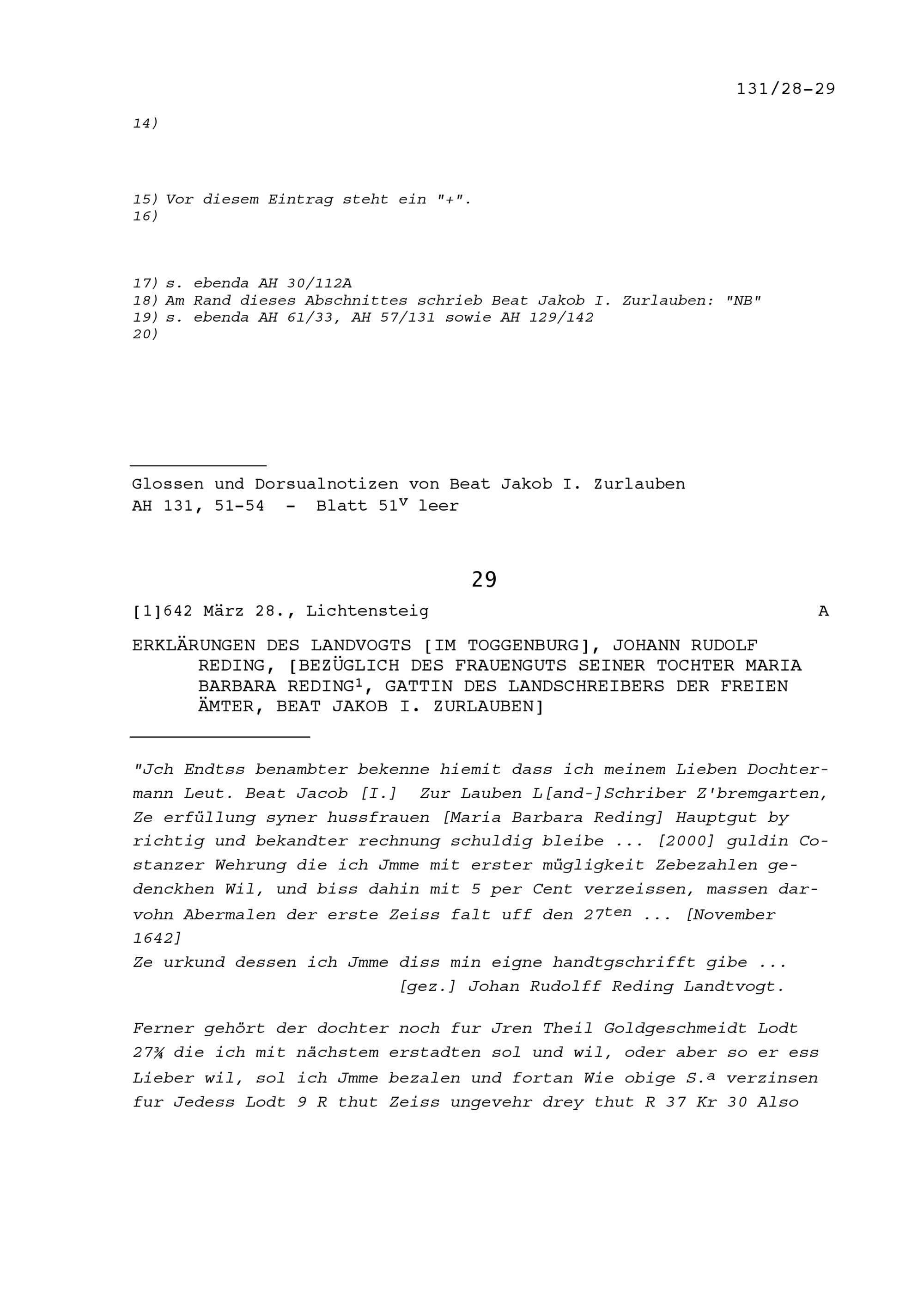 Erklärungen von Johann Rudolf Reding, Landvogt im Toggenburg, bezüglich des Frauenguts seiner Tochter Maria Barbara Reding, Gattin von Beat Jakob I. Zurlauben, Landschreiber der Freien Ämter