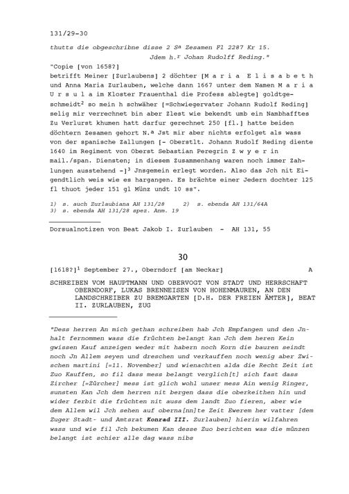 Schreiben von Lukas Brenneisen von Hohenmauren, Hauptmann und Obervogt von Stadt und Herrschaft Oberndorf, an Beat II. Zurlauben, Landschreiber der Freien Ämter, Bremgarten