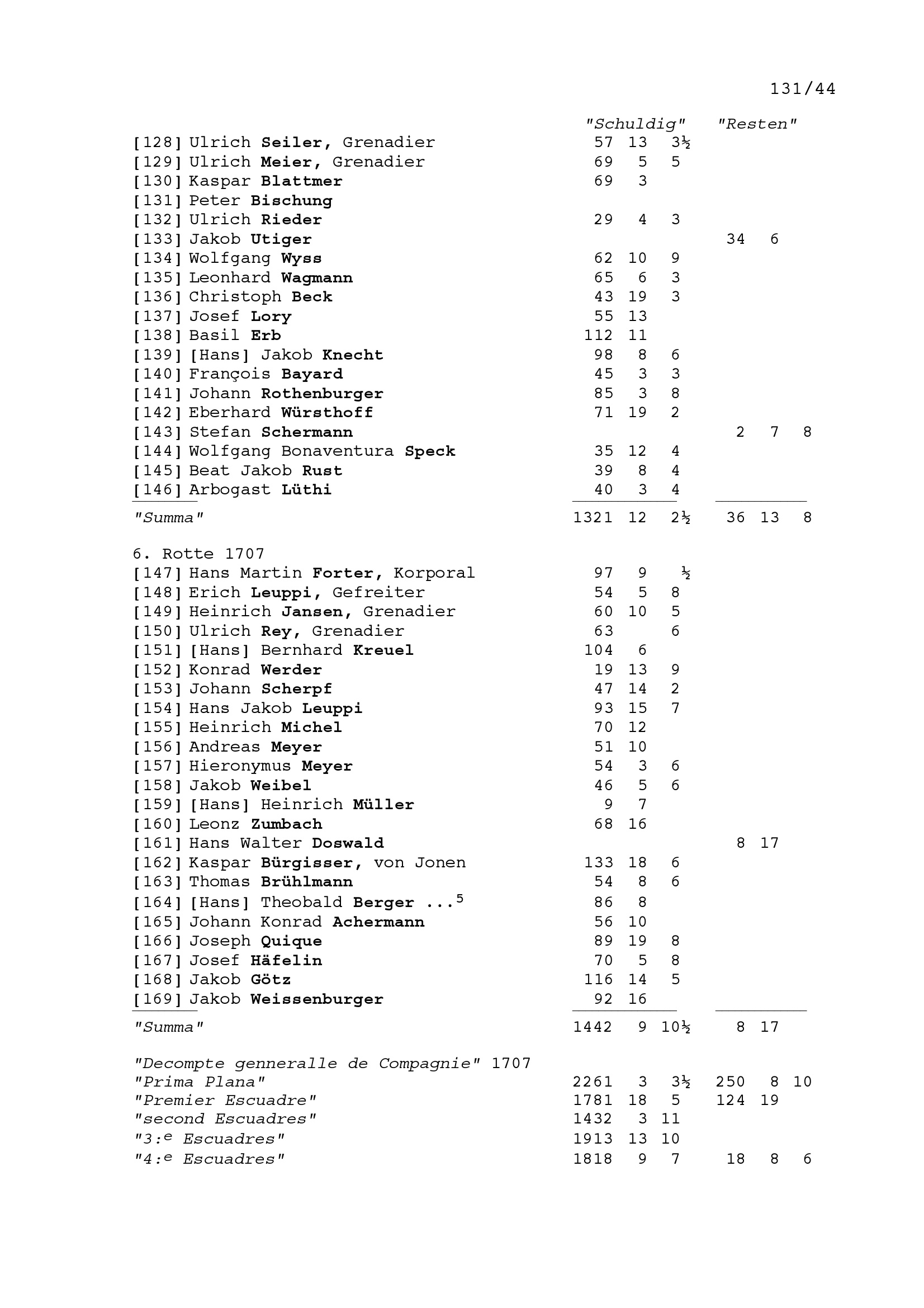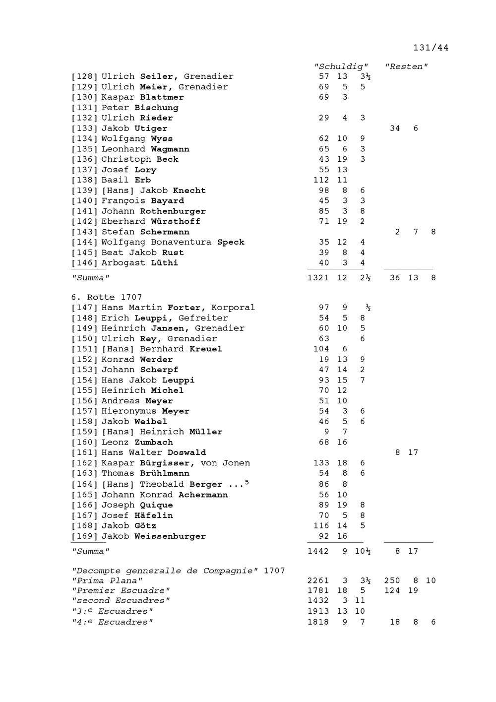 Generalabrechnung aller Offiziere, Sergeanten und Soldaten der Kompanie von Beat Jakob II. Zurlauben, Hauptmann im Schweizer Regiment Pfyffer für 1707, in Namur