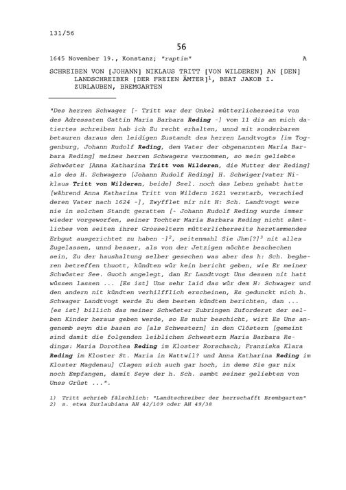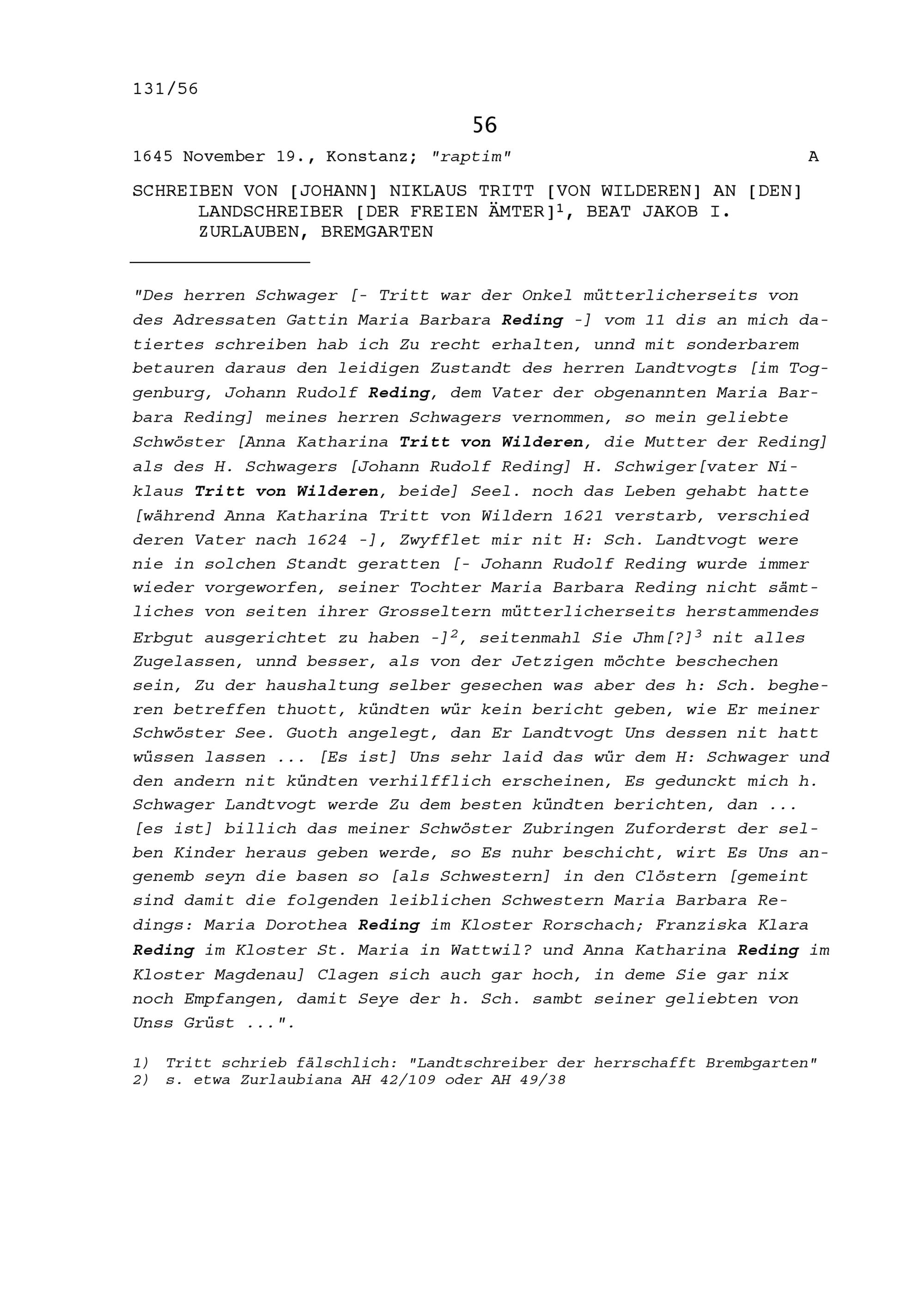 Schreiben von Johann Niklaus Tritt von Wilderen an Beat Jakob I. Zurlauben, Landschreiber der Freien Ämter, Bremgarten
