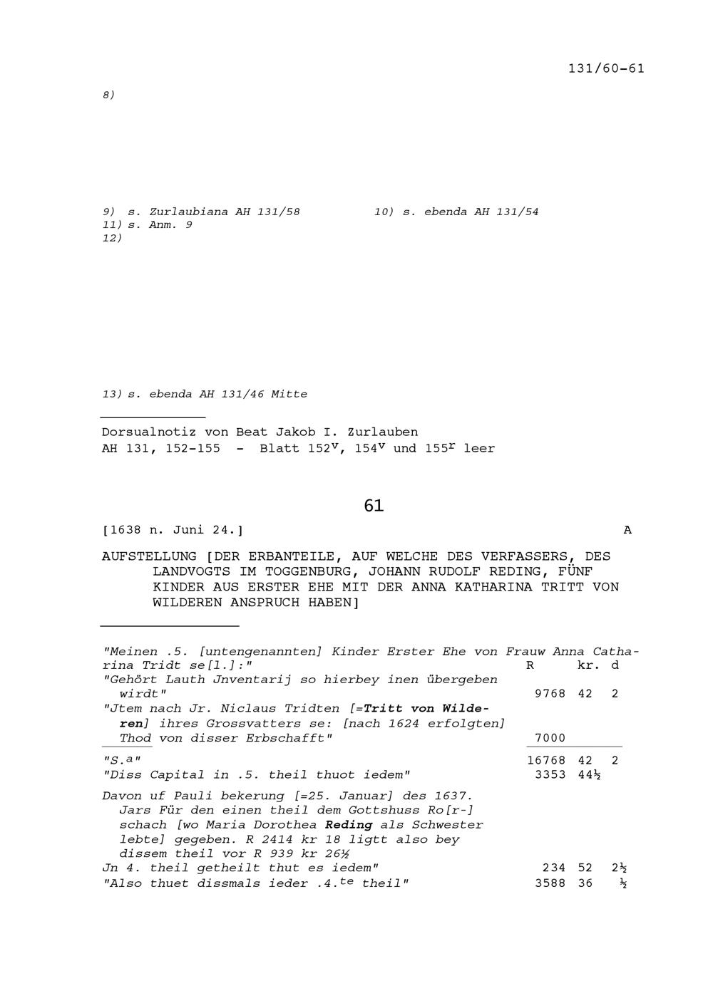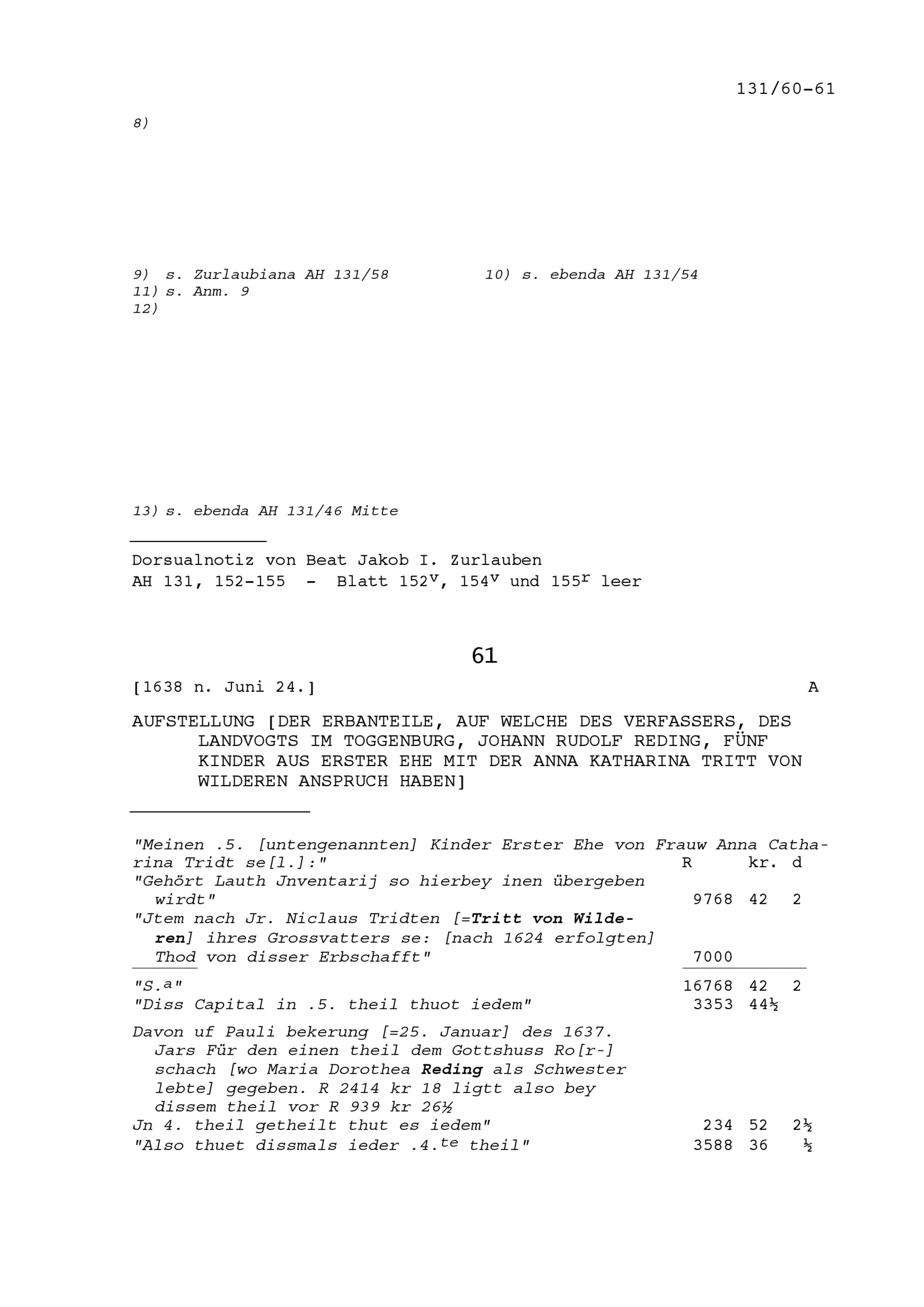 Aufstellung der Erbanteile, auf welche die fünf Kinder von Johann Rudolf Reding, Landvogt im Toggenburg, aus Erster Ehe mit Anna Katharina Tritt von Wilderen Anspruch haben