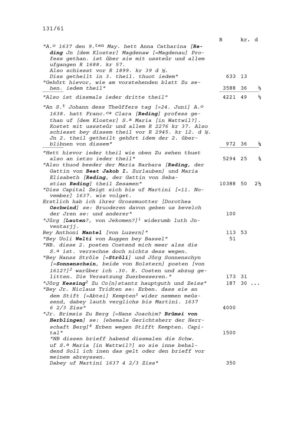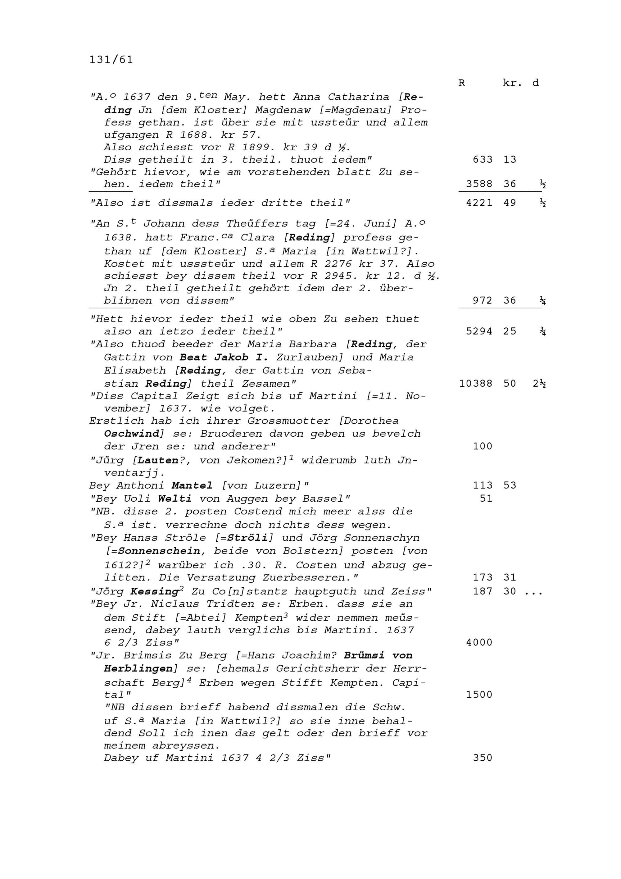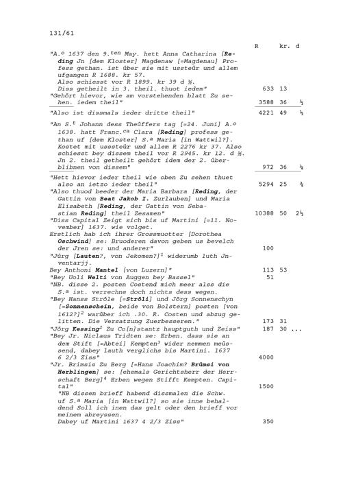 Aufstellung der Erbanteile, auf welche die fünf Kinder von Johann Rudolf Reding, Landvogt im Toggenburg, aus Erster Ehe mit Anna Katharina Tritt von Wilderen Anspruch haben