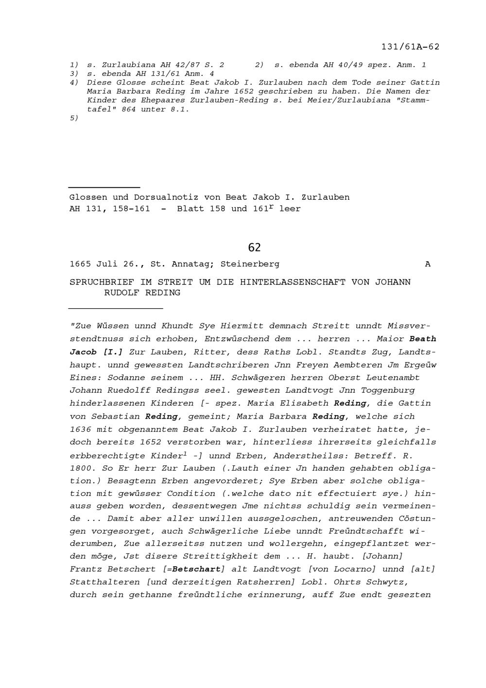 Spruchbrief im Streit um die Hinterlassenschaft von Johann Rudolf Reding