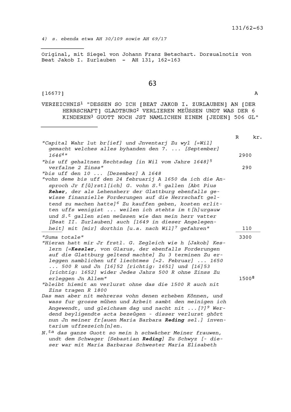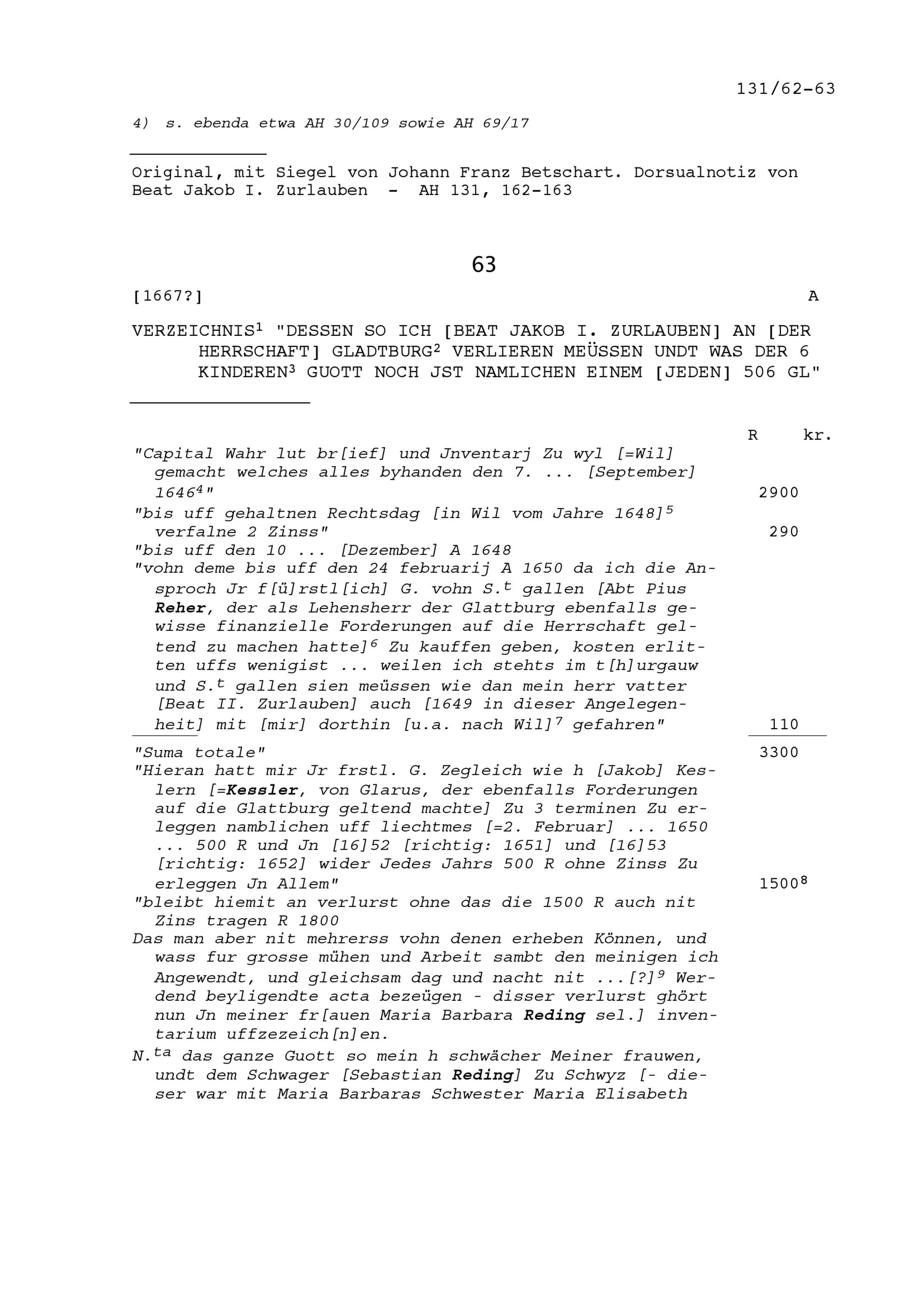 Verluste von Beat Jakob I. Zurlauben an der Herrschaft Glattburg und Anspruch seiner...