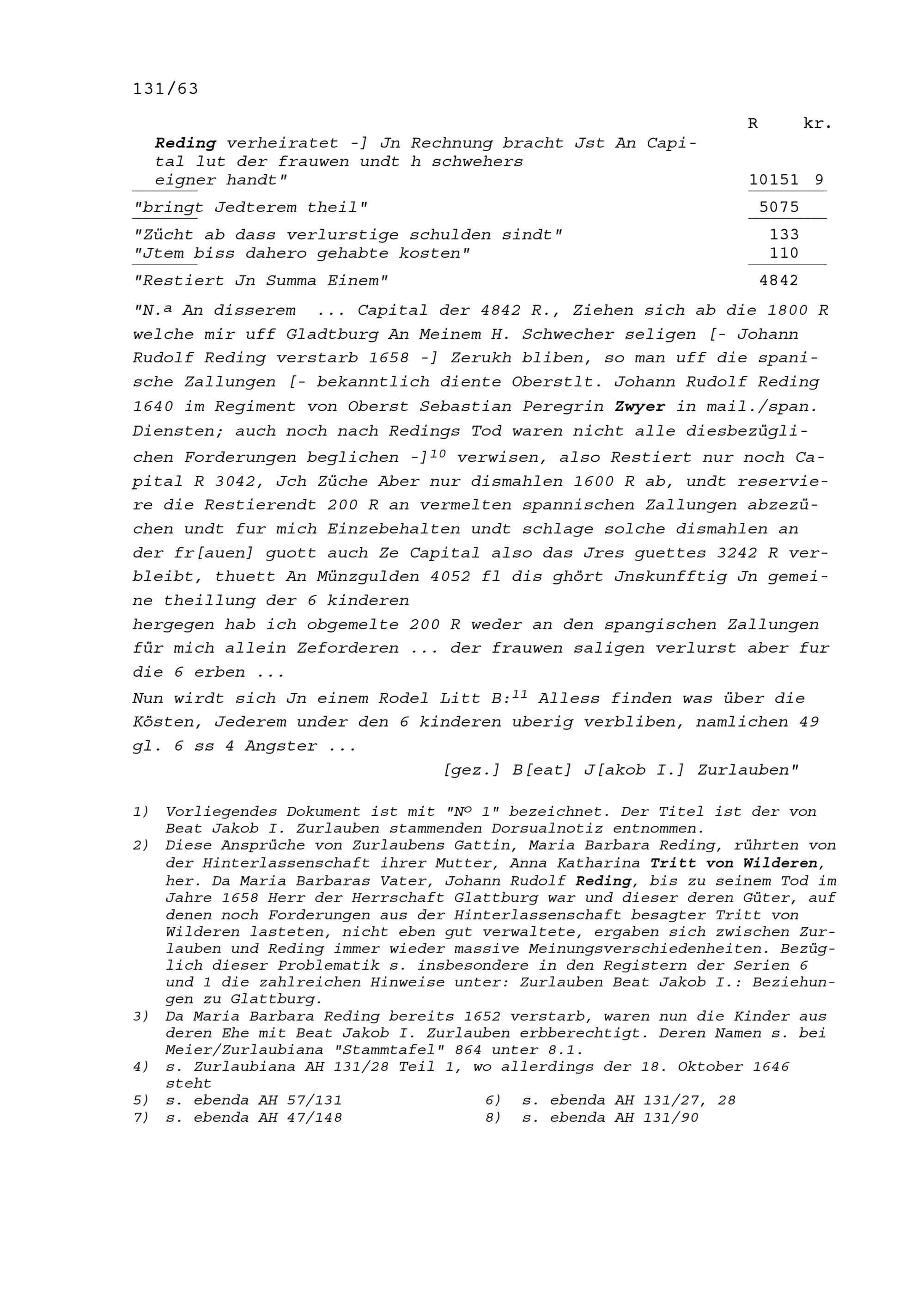 Verluste von Beat Jakob I. Zurlauben an der Herrschaft Glattburg und Anspruch seiner sechs Kindern, nämlich 506 Gulden