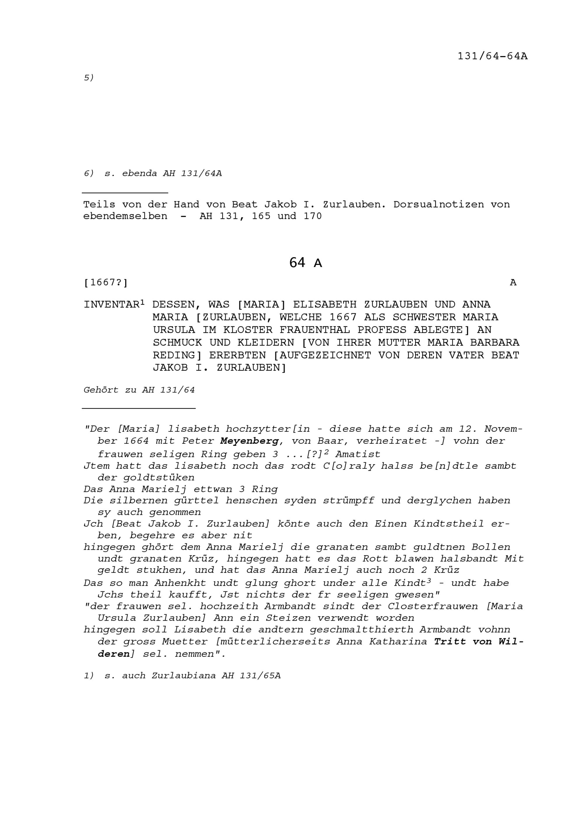 Inventar dessen, was Maria Elisabeth Zurlauben und Anna Maria Zurlauben, welche 1667 als Klosterfrau Maria Ursula im Frauenkloster Frauenthal Profess ablegte, an Schmuck und Kleidern von Maria Barbara Reding, ihrer Mutter, ererbten, aufgezeichnet von Beat Jakob I. Zurlauben
