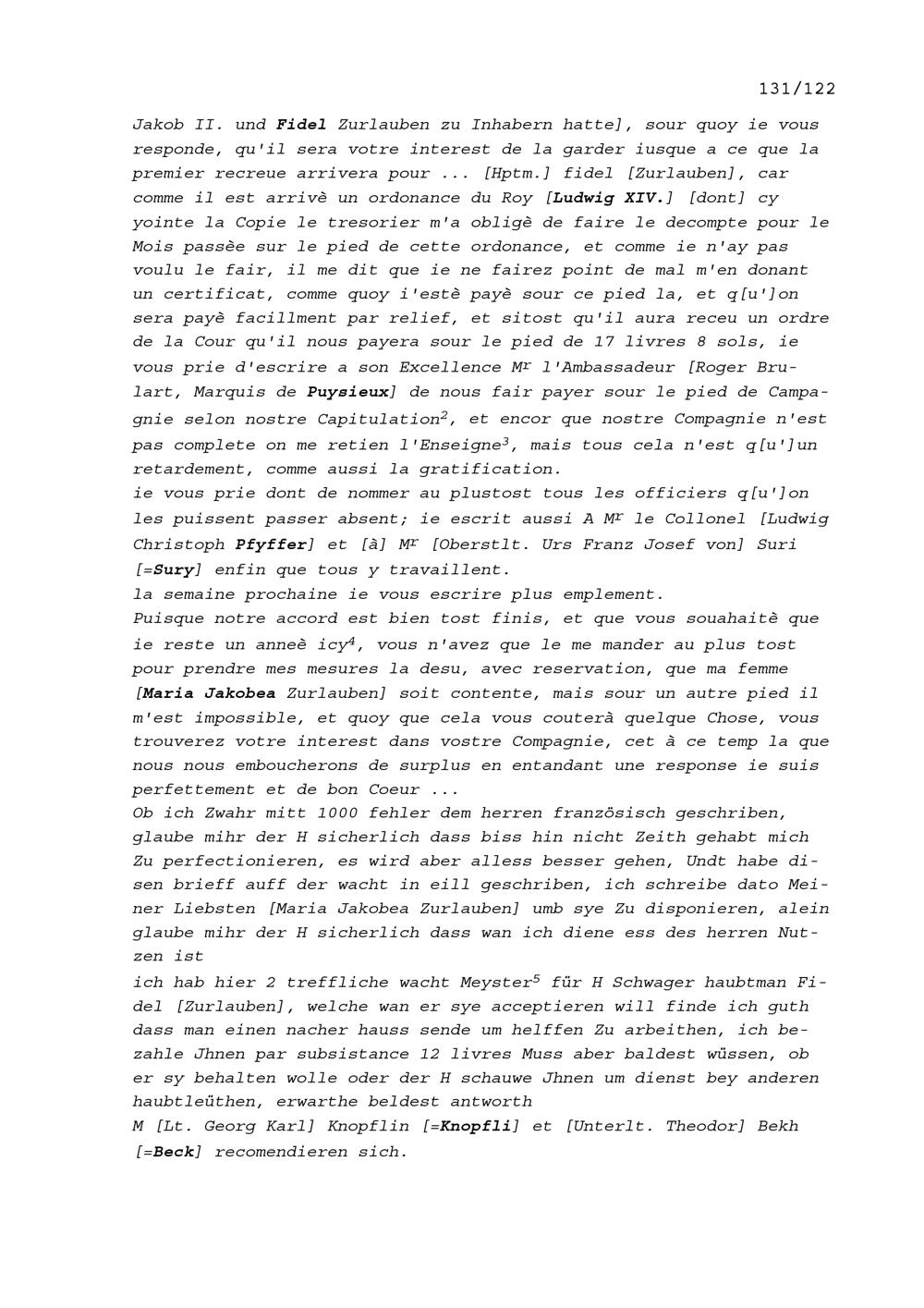 Schreiben von Wolfgang Damian Müller, Kommandant der Kompanie Zurlauben im Regiment Pfyffer in französischen Diensten, an Beat Jakob II. Zurlauben, Kompanieinhaber und Hauptmann