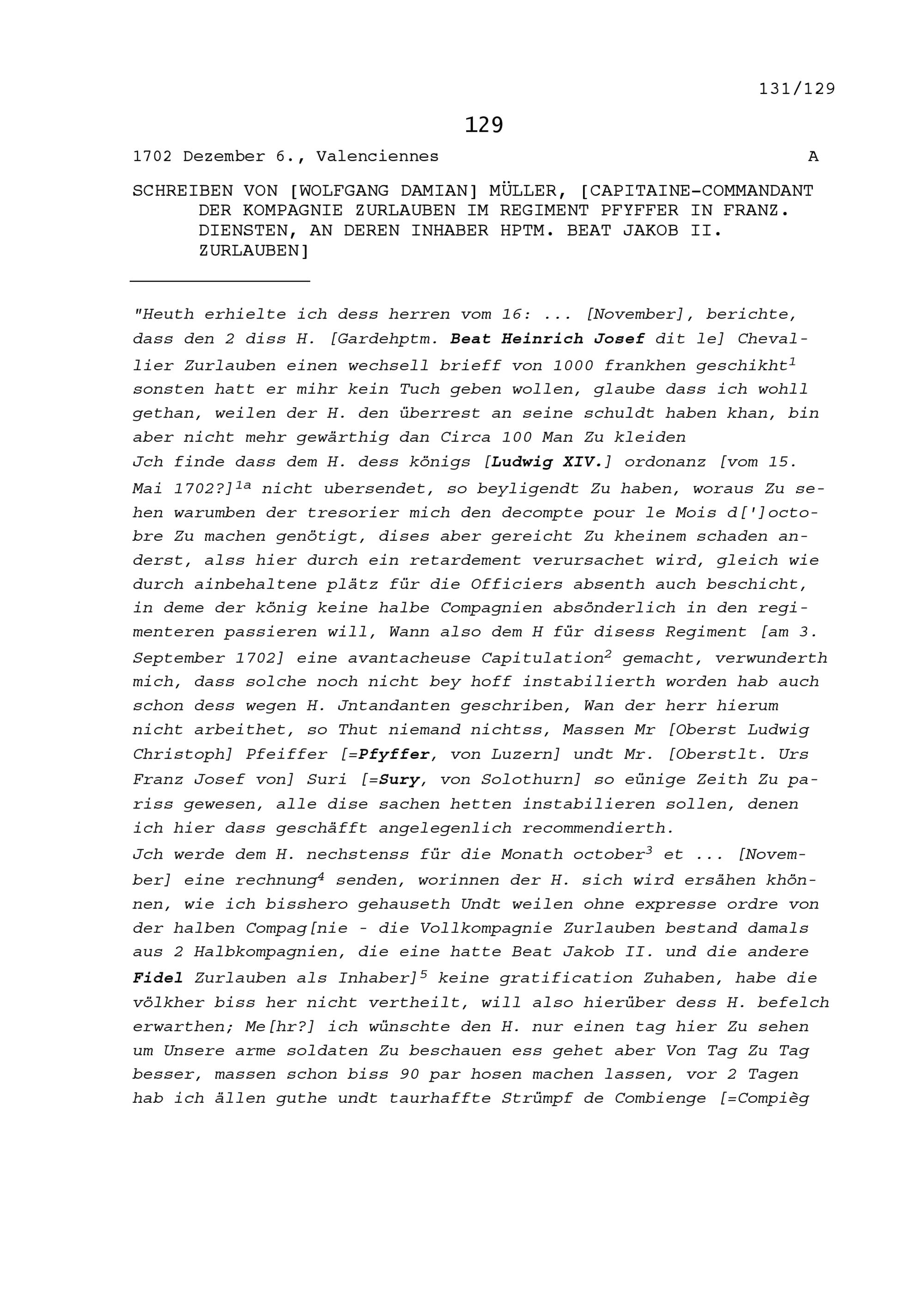 Schreiben von Wolfgang Damian Müller, Kommandant der Kompanie Zurlauben im Regiment...