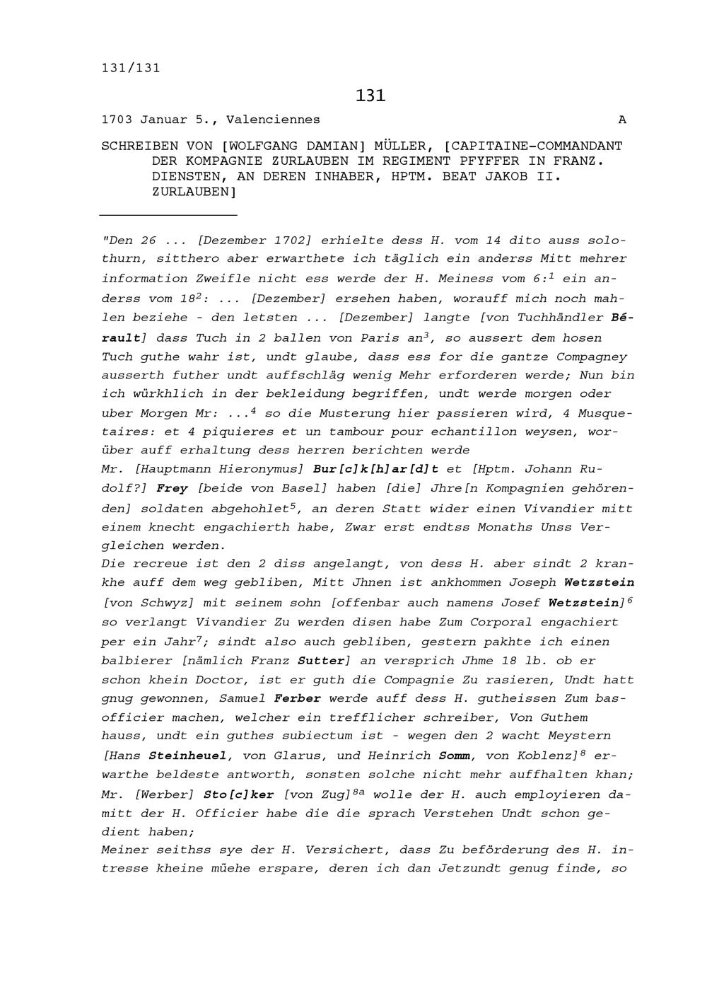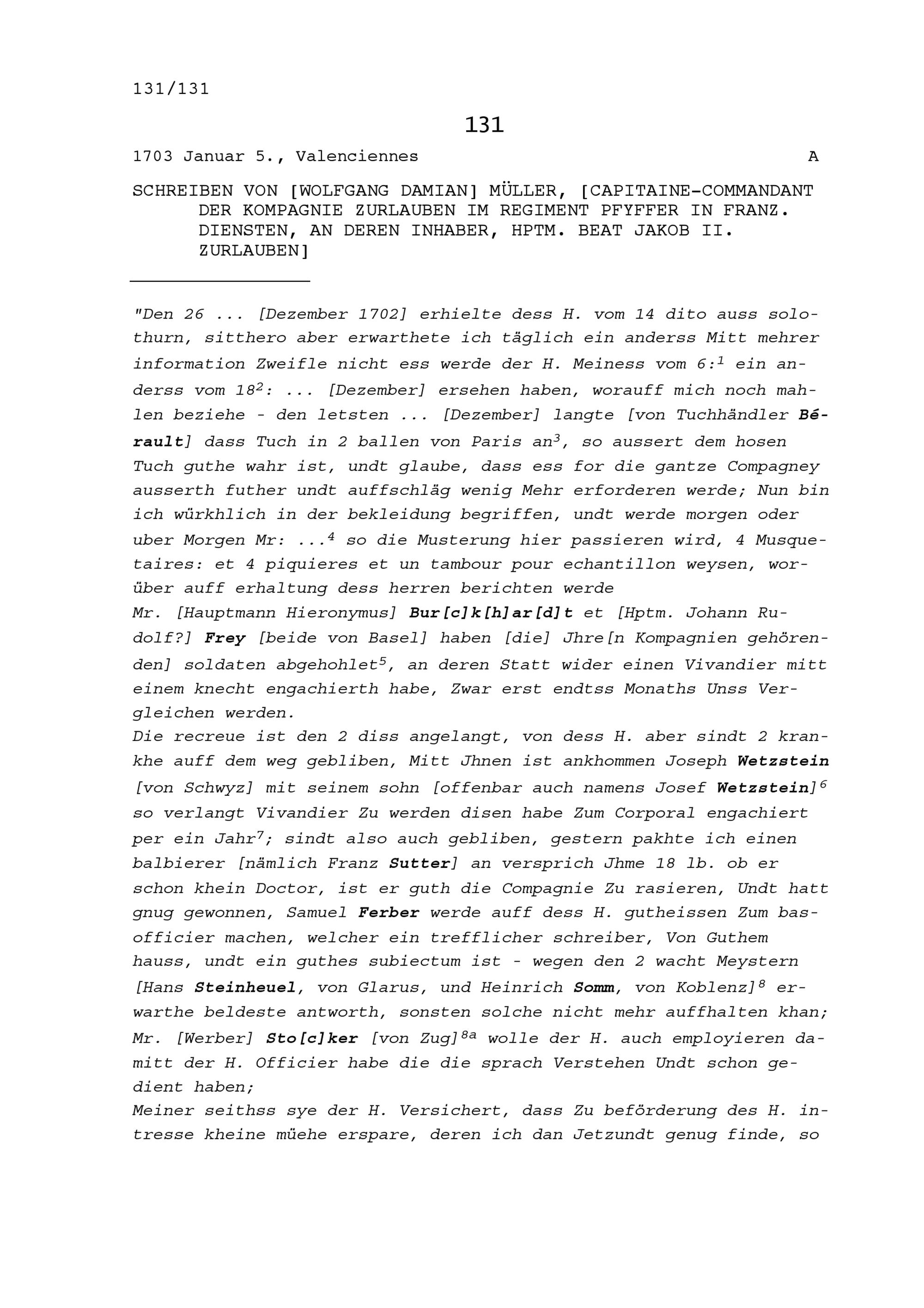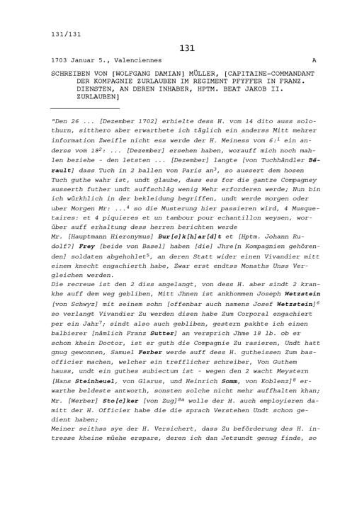 Schreiben von Wolfgang Damian Müller, Kommandant der Kompanie Zurlauben im Regiment...