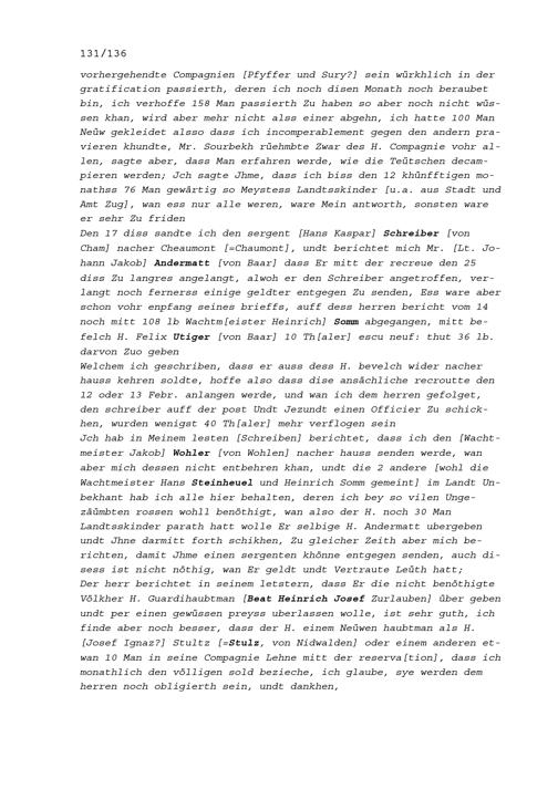 Schreiben von Wolfgang Damian Müller, Kommandant der Kompanie Zurlauben im Regiment...