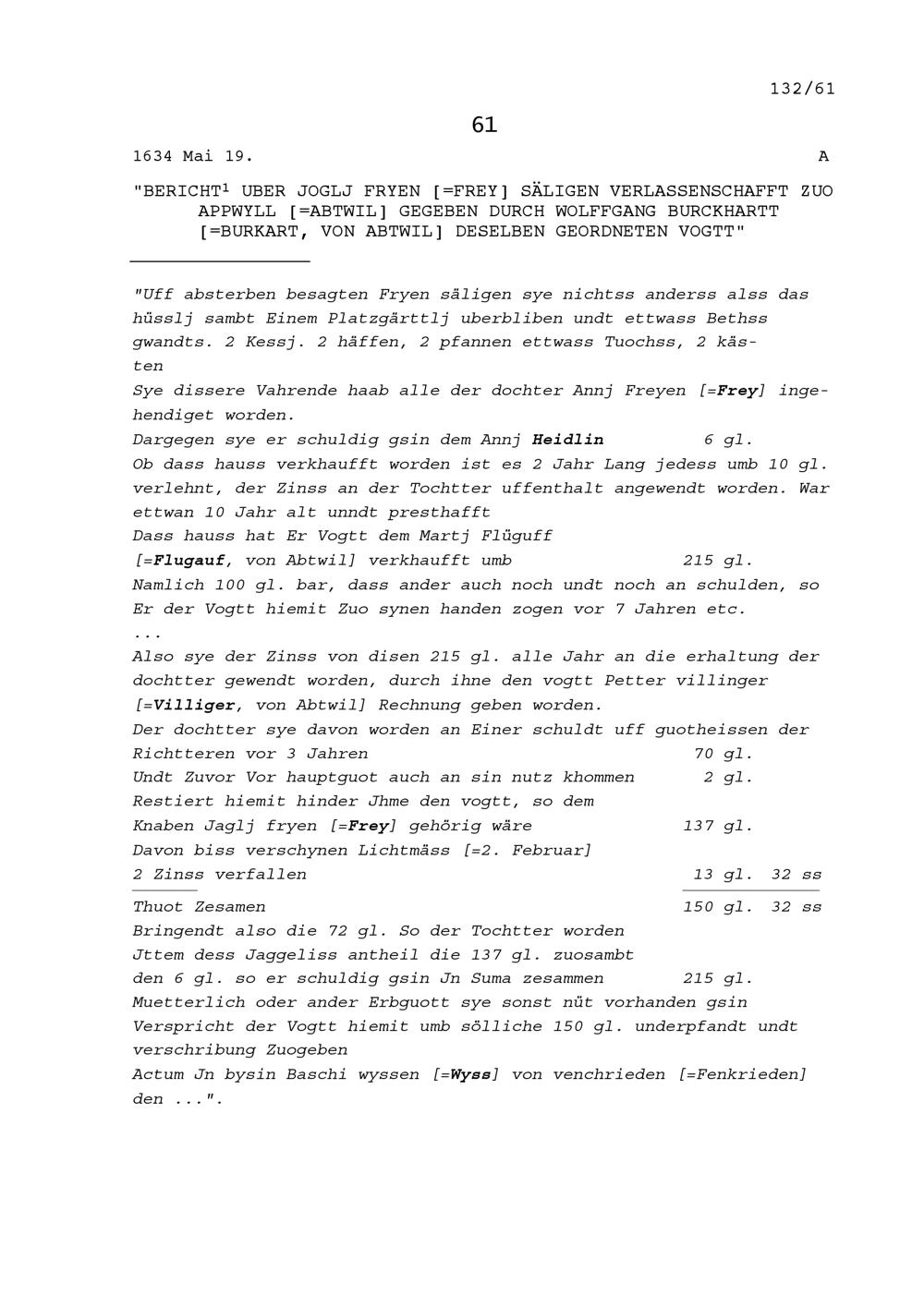 Bericht über die Verlassenschaft von Jakob Frey, genannt Joggli, Abtwil zuhanden von Wolfgang Burkart, dessen Vogt, von Abtwil