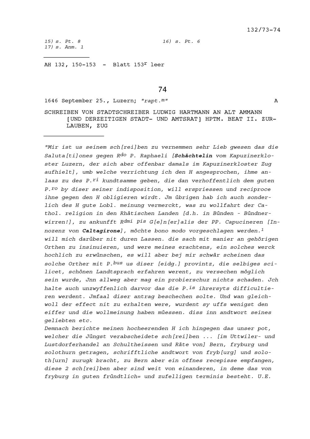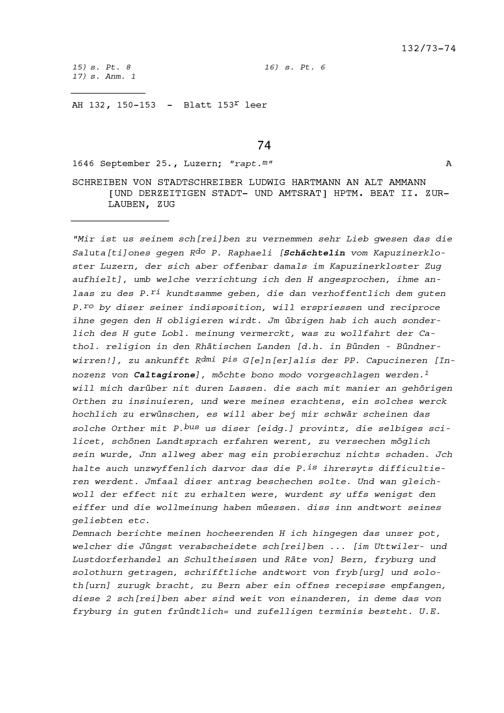 Schreiben von Ludwig Hartmann, Stadtschreiber, an Beat II. Zurlauben, Hauptmann und Stadt- und Amtrat, Zug