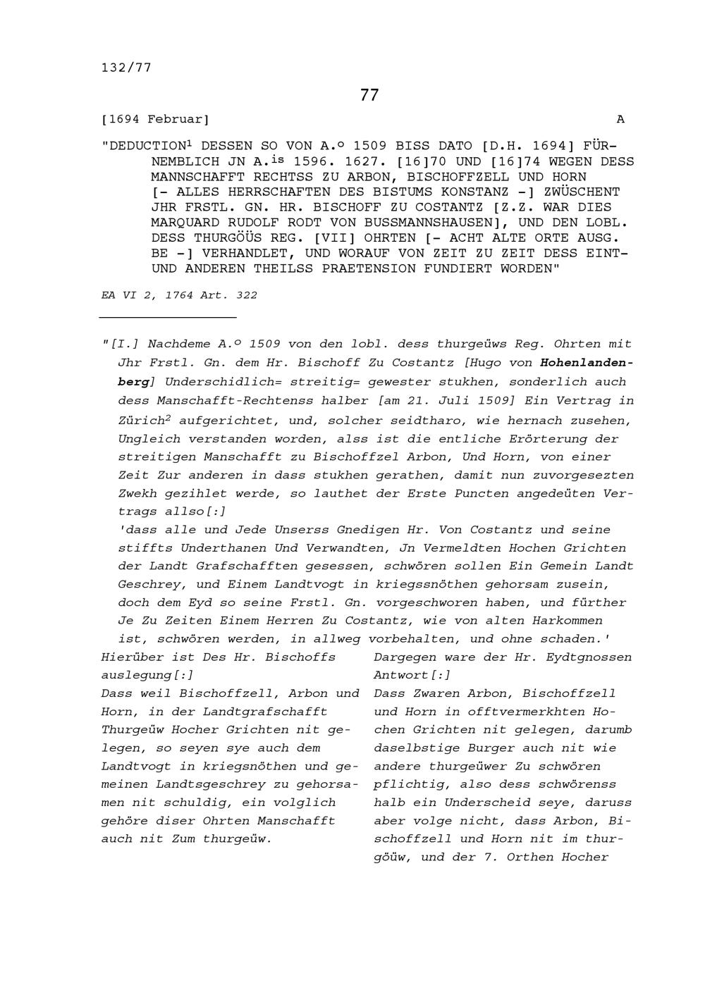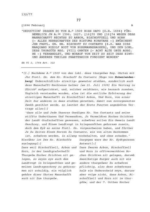Mannschaftsrechte zu Arbon, Bischofszell und Horn, alles Herrschaften des Bistums Konstanz von 1509 bis 1694, hauptsächlich 1596, 1627, 1670 und 1674 (Auszug) wegen des Streits zwischen Marquard Rudolf Rodt von Bausmannshausen, Bischof von Konstanz und den den Thurgau regierenden Sieben Orte