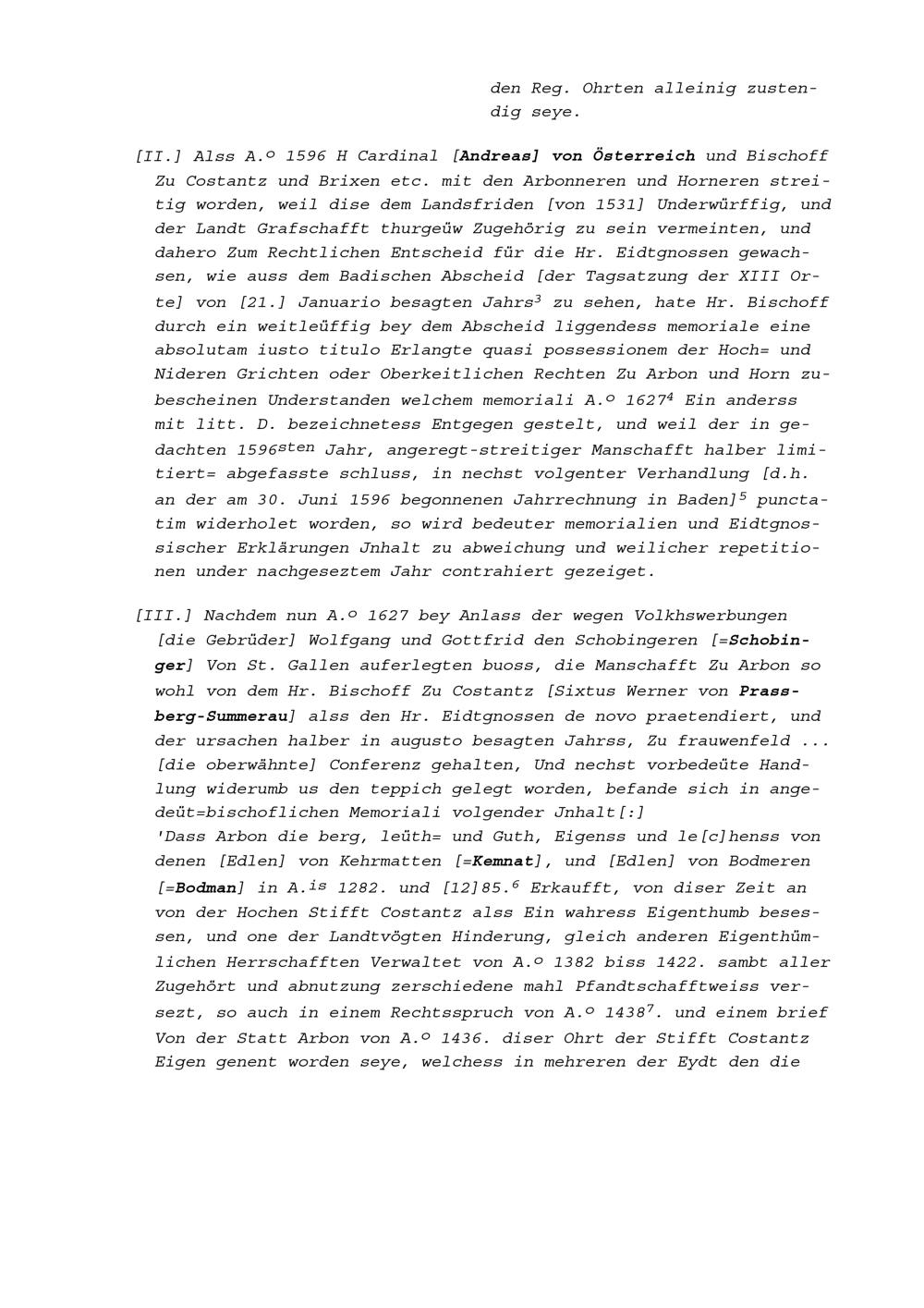 Mannschaftsrechte zu Arbon, Bischofszell und Horn, alles Herrschaften des Bistums Konstanz von 1509 bis 1694, hauptsächlich 1596, 1627, 1670 und 1674 (Auszug) wegen des Streits zwischen Marquard Rudolf Rodt von Bausmannshausen, Bischof von Konstanz und den den Thurgau regierenden Sieben Orte
