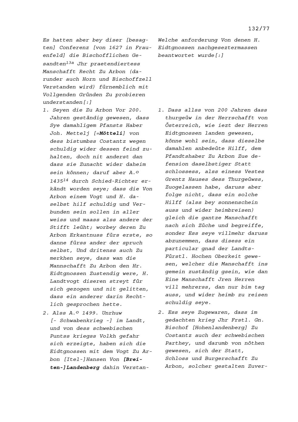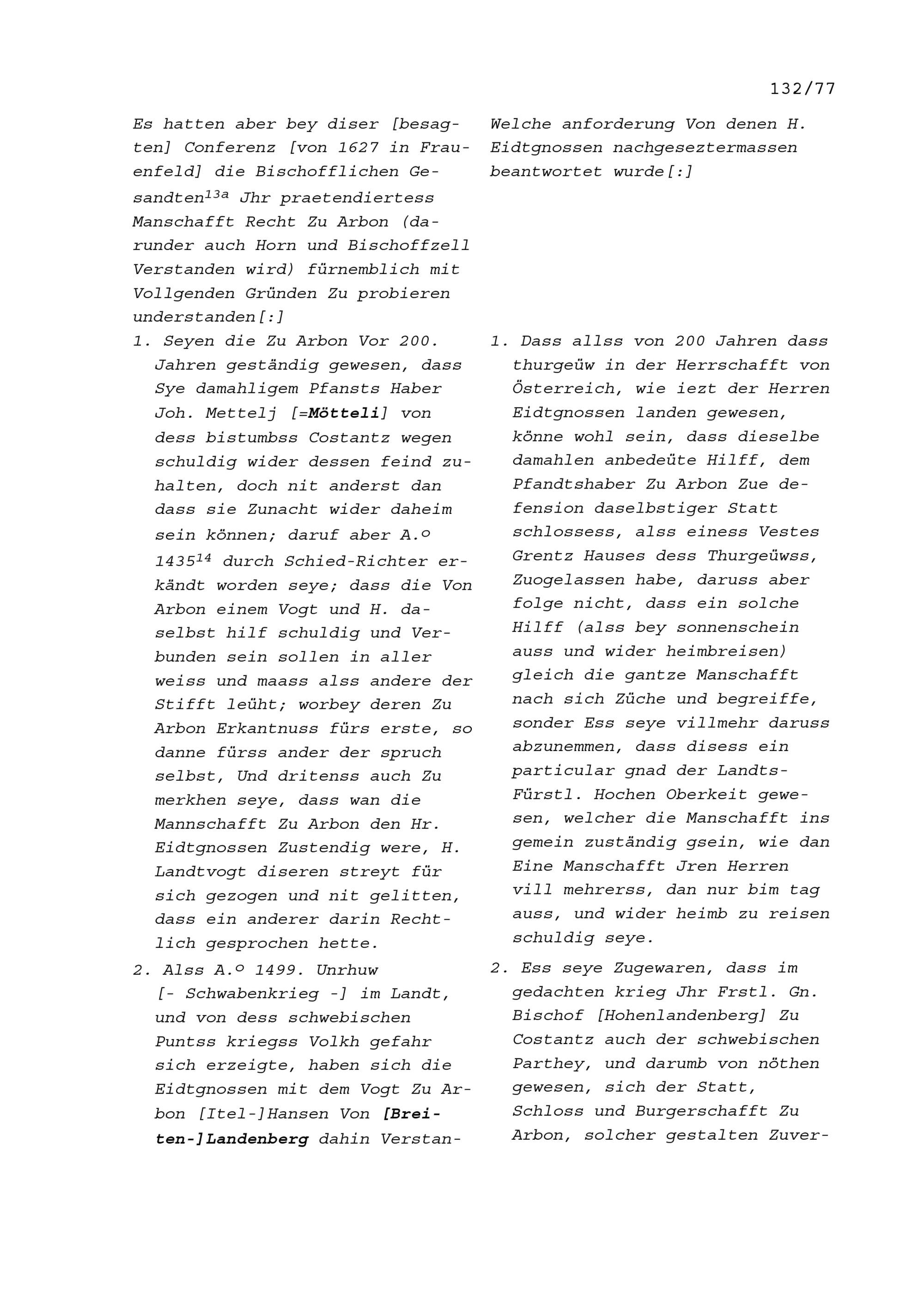 Mannschaftsrechte zu Arbon, Bischofszell und Horn, alles Herrschaften des Bistums Konstanz von 1509 bis 1694, hauptsächlich 1596, 1627, 1670 und 1674 (Auszug) wegen des Streits zwischen Marquard Rudolf Rodt von Bausmannshausen, Bischof von Konstanz und den den Thurgau regierenden Sieben Orte