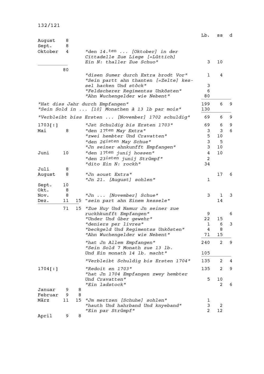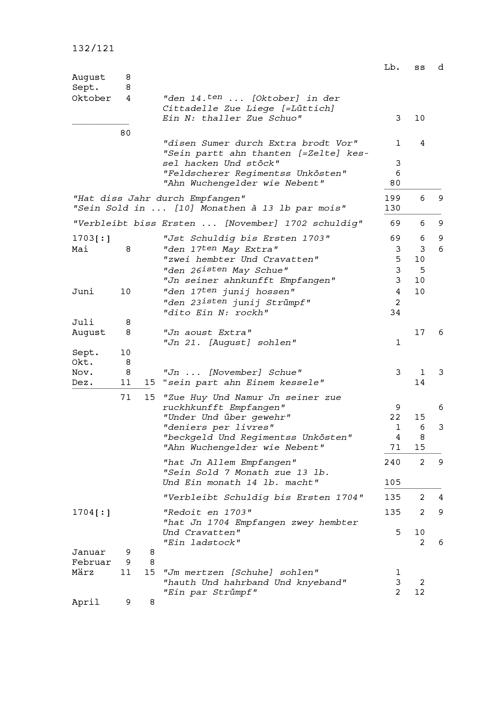 Abrechnung für Leonz Schmid, Soldat in der Kompanie von Beat Heinrich Josef Zurlauben, Gardehauptmann, im Regiment Castella in französischen Diensten