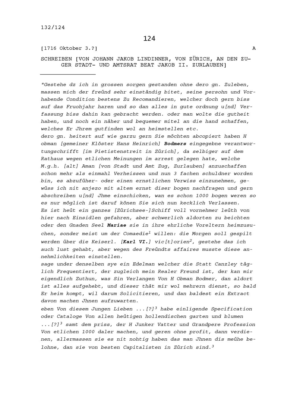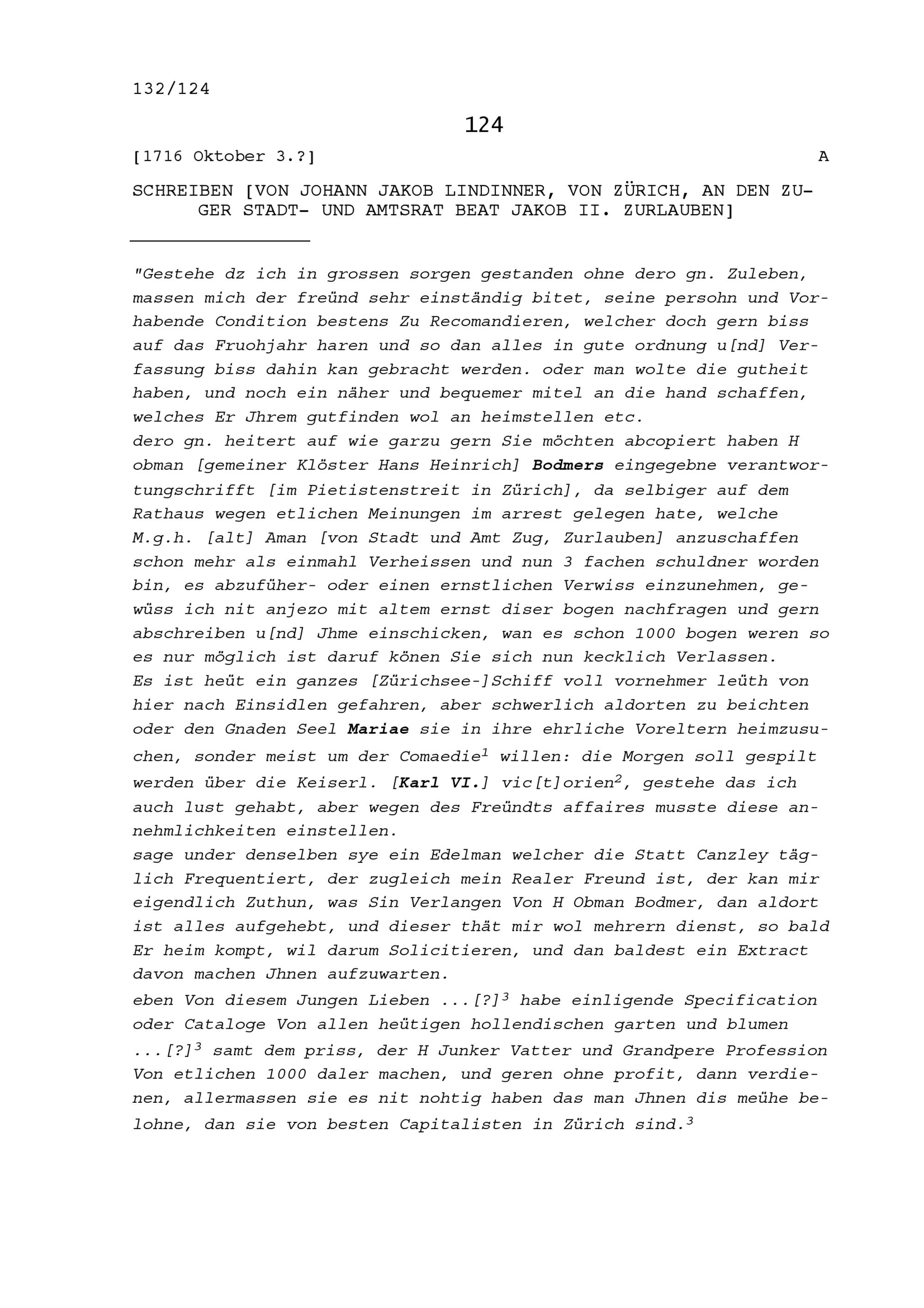 Schreiben von Johann Jakob Lindinner von Zürich, an Beat Jakob II. Zurlauben, Stadt- und Amtrat Zug