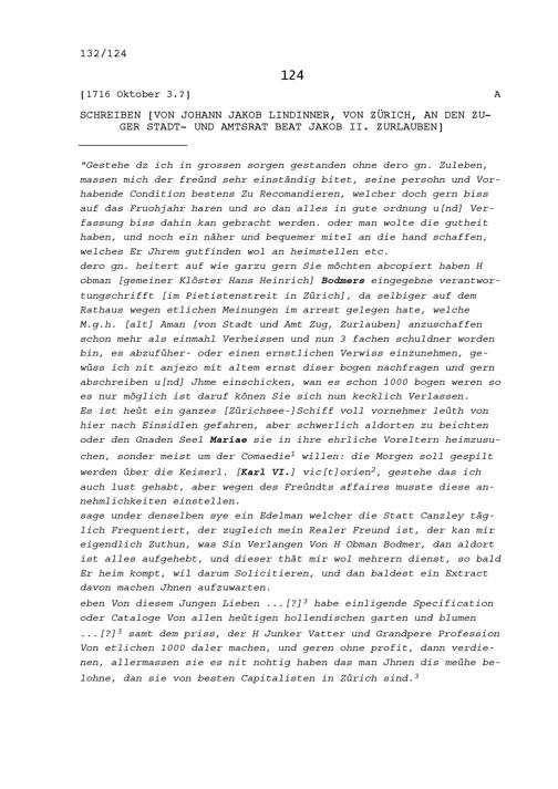 Schreiben von Johann Jakob Lindinner von Zürich, an Beat Jakob II. Zurlauben, Stadt-...
