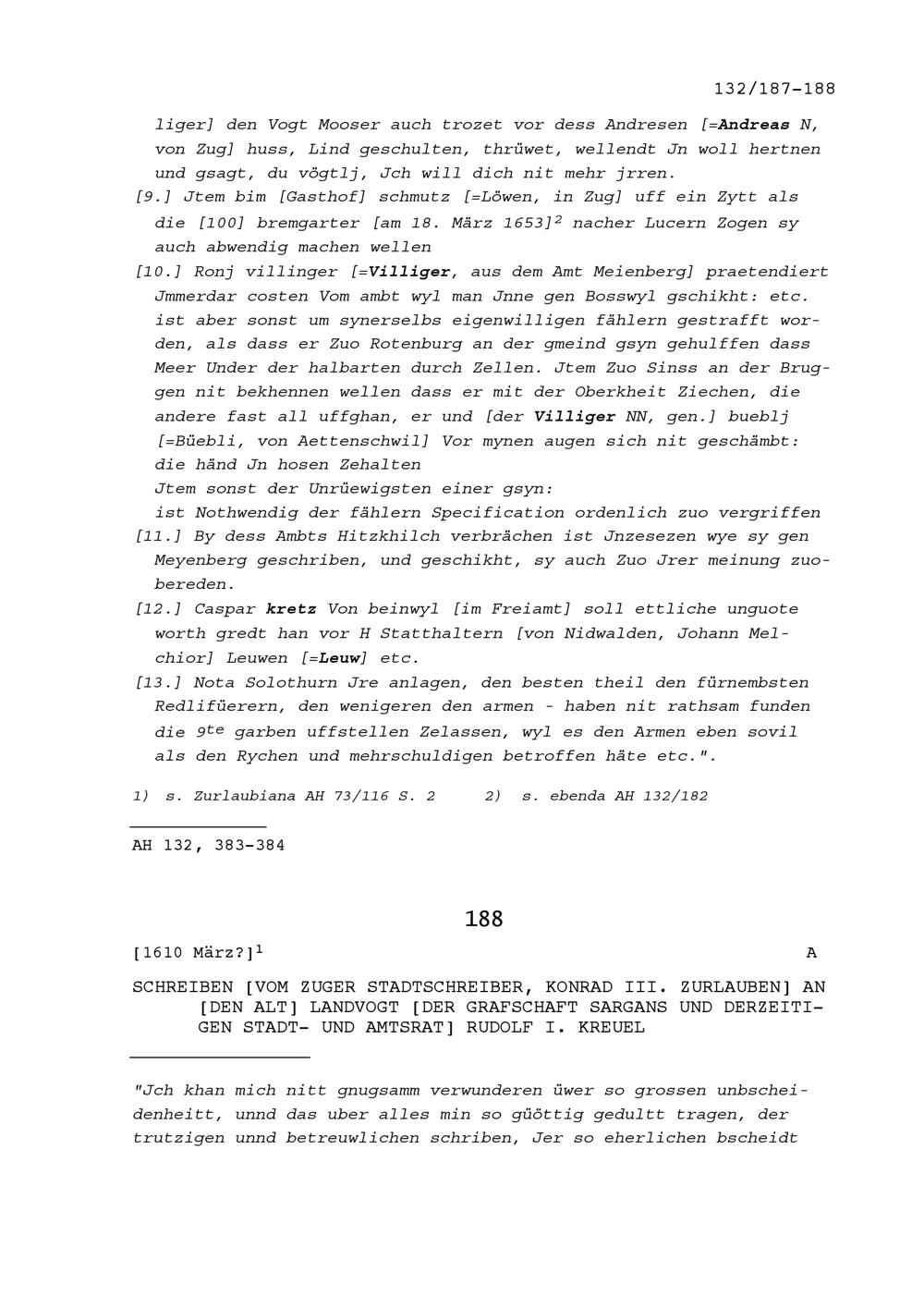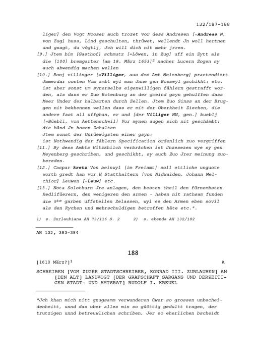 Schreiben von Konrad III. Zurlauben, Zuger Stadtschreiber, an Rudolf I. Kreuel, Altlandvogt der Grafschaft Sargans und Stadt- und Amtrat