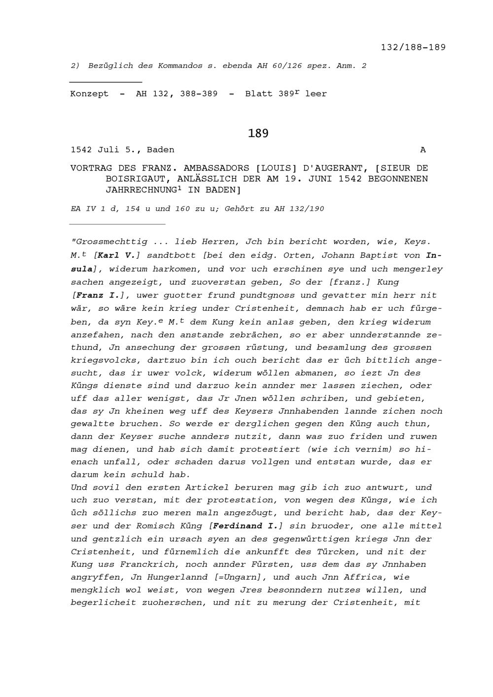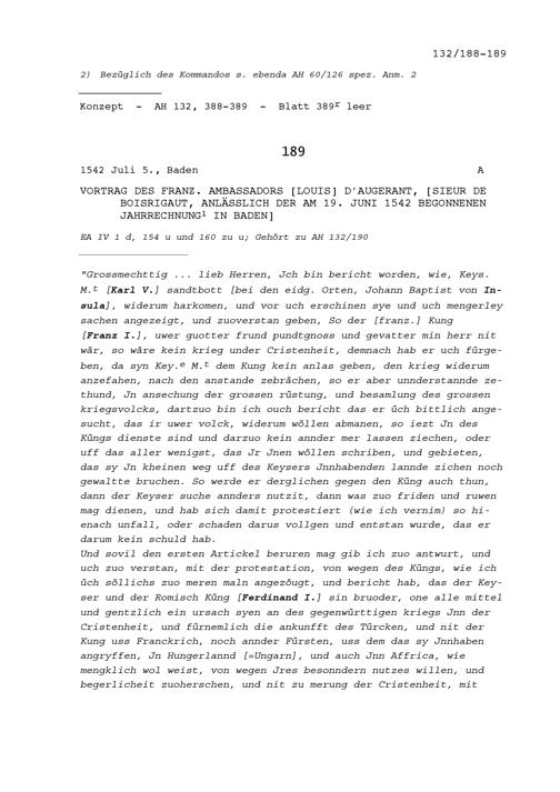 Vortrag von Louis d'Augerant, Sieur de Boisrigaut, Ambassador von Frankreich, anlässlich der am 19. Juni 1542 begonnenen Jahrrechnung in Baden