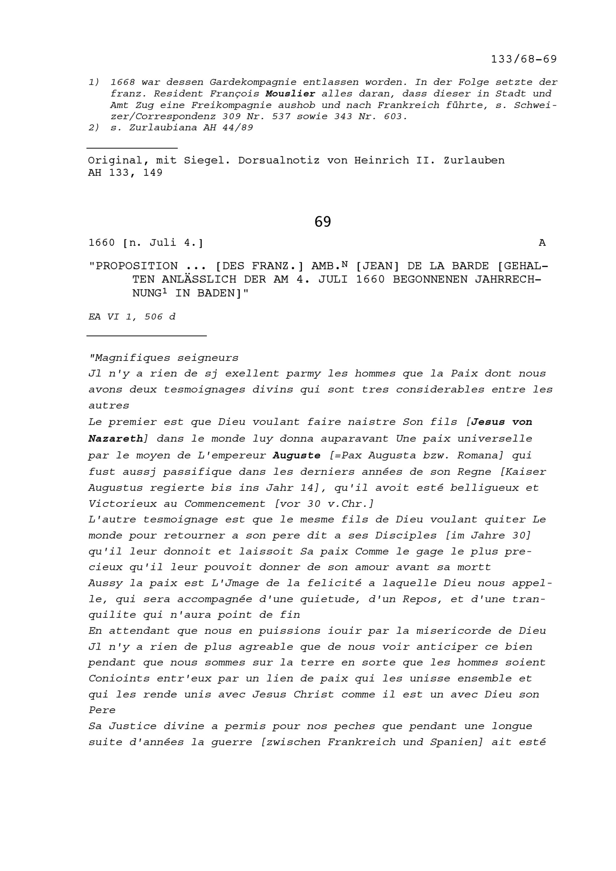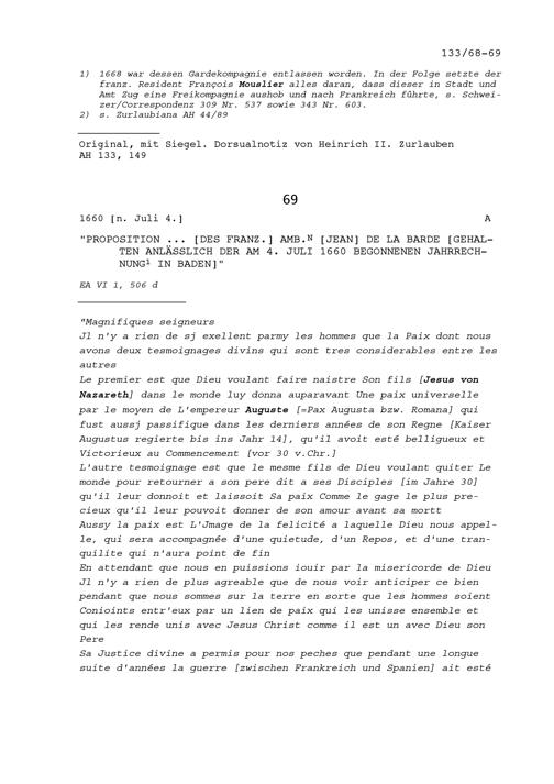 Vortrag Jean de la Barde, Ambassador von Frankreich, gehalten anlässlich der am 4. Juli 1660 begonnenen Jahrrechnung in Baden