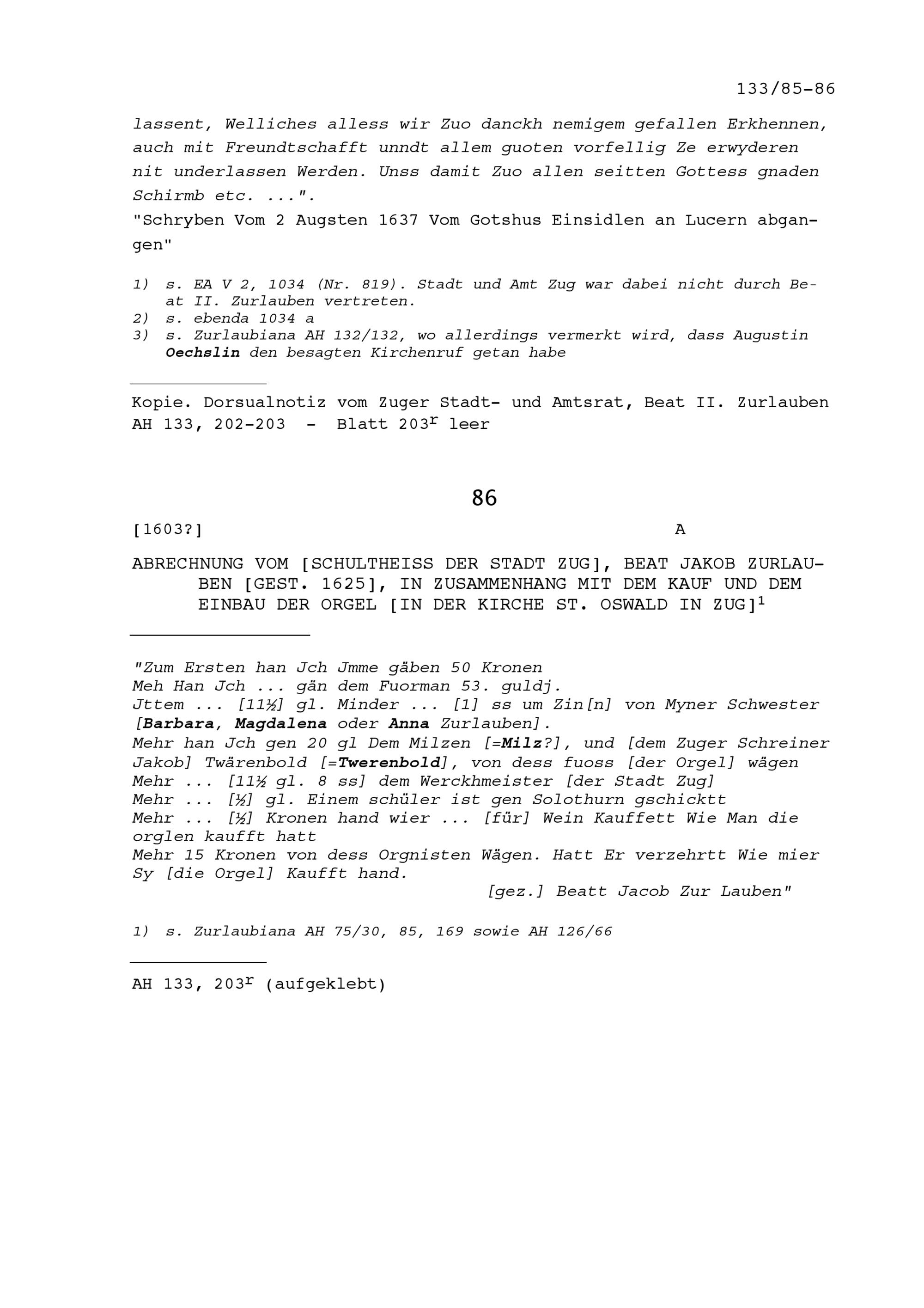Abrechnung von Beat Jakob Zurlauben, selig, Ammann der Stadt Zug, in Zusammenhang mit dem Kauf und dem Einbau der Orgel in der Kirche Sankt Oswald in Zug