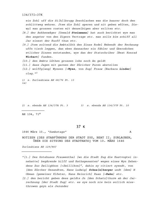 Notiz von Beat II. Zurlauben, Stabführer der Stadt Zug, über die Sitzung des Stadtrats vom 10. März 1646