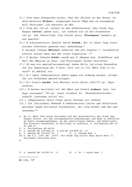 Notiz von Beat II. Zurlauben, Stabführer der Stadt Zug, über die Sitzung des Stadtrats vom 10. März 1646