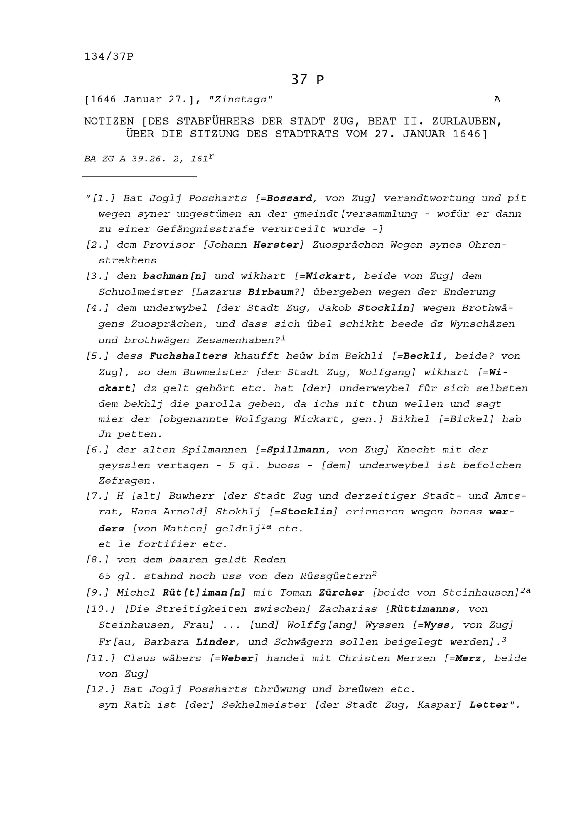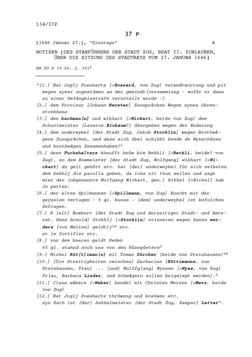 Notiz von Beat II. Zurlauben, Stabführer der Stadt Zug, über die Sitzung des Stadtrats vom 27. Januar 1646