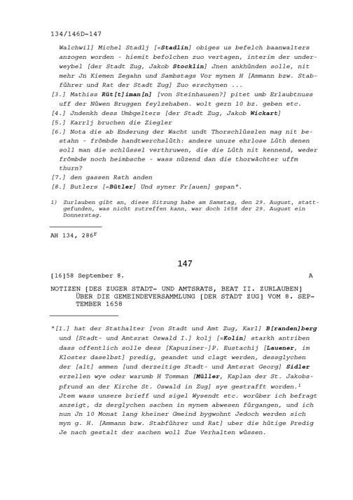 Notiz von Beat II. Zurlauben, Stadt- und Amtrat Zug, über die Gemeindeversammlung der Stadt Zug vom 8. September 1658