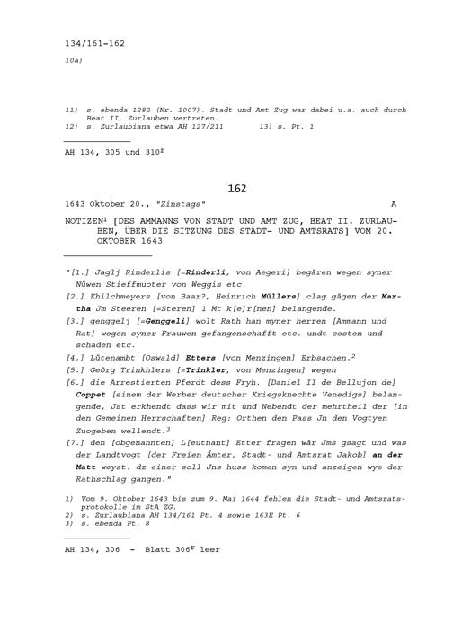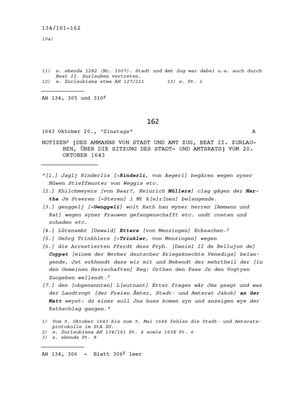 Notiz von Beat II. Zurlauben, Ammann von Stadt und Amt Zug, über die Sitzung des Stadt- und Amtrats vom 20. Oktober 1643