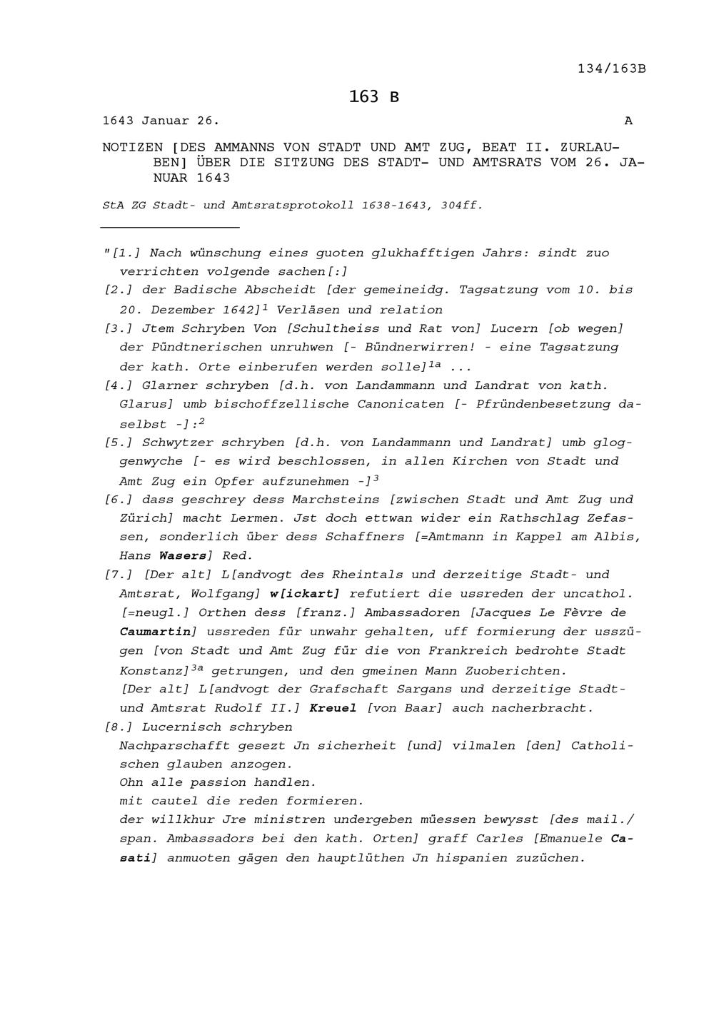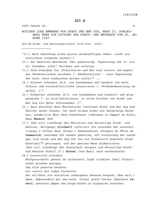 Notiz von Beat II. Zurlauben, Ammann von Stadt und Amt Zug, über die Sitzung des Stadt- und Amtrats vom 26. Januar 1643