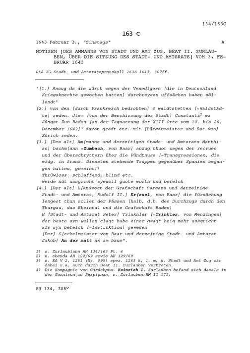 Notiz von Beat II. Zurlauben, Ammann von Stadt und Amt Zug, über die Sitzung des Stadt- und Amtrats vom 3. Februar 1643