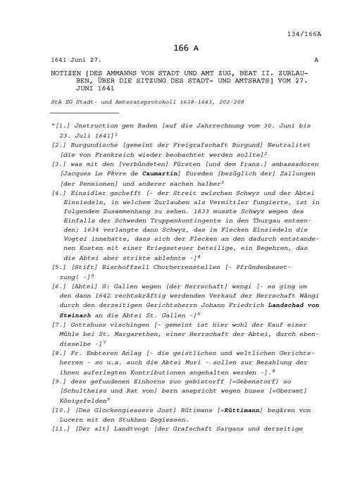 Notiz von Beat II. Zurlauben, Ammann von Stadt und Amt Zug, über die Sitzung des Stadt- und Amtrats vom 27. Juni 1641