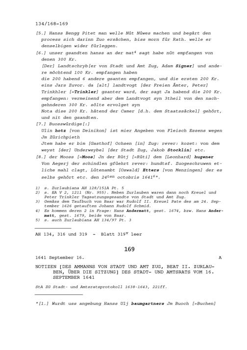 Notiz von Beat II. Zurlauben, Ammann von Stadt und Amt Zug, über die Sitzung des Stadt- und Amtrats vom 16. September 1641