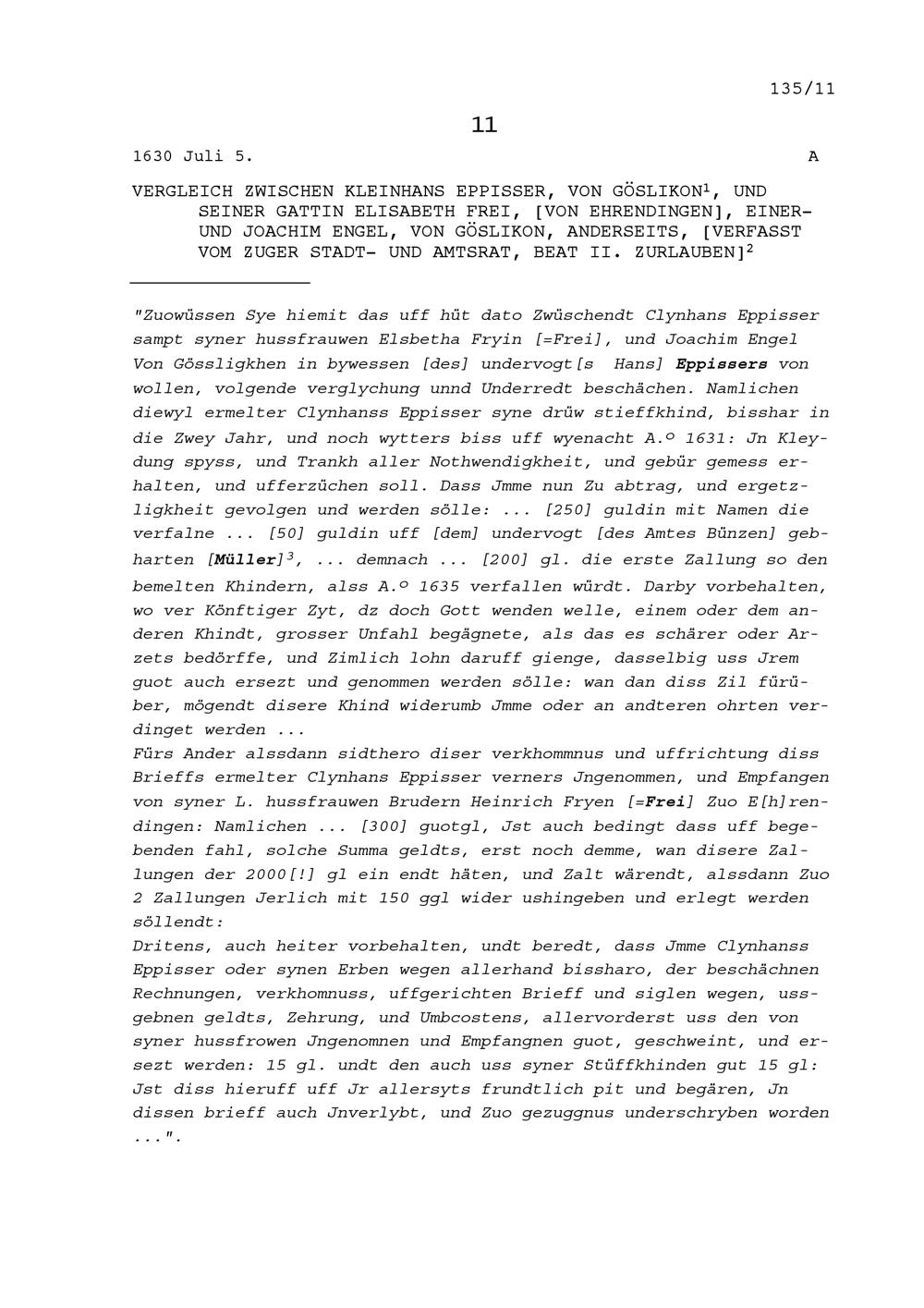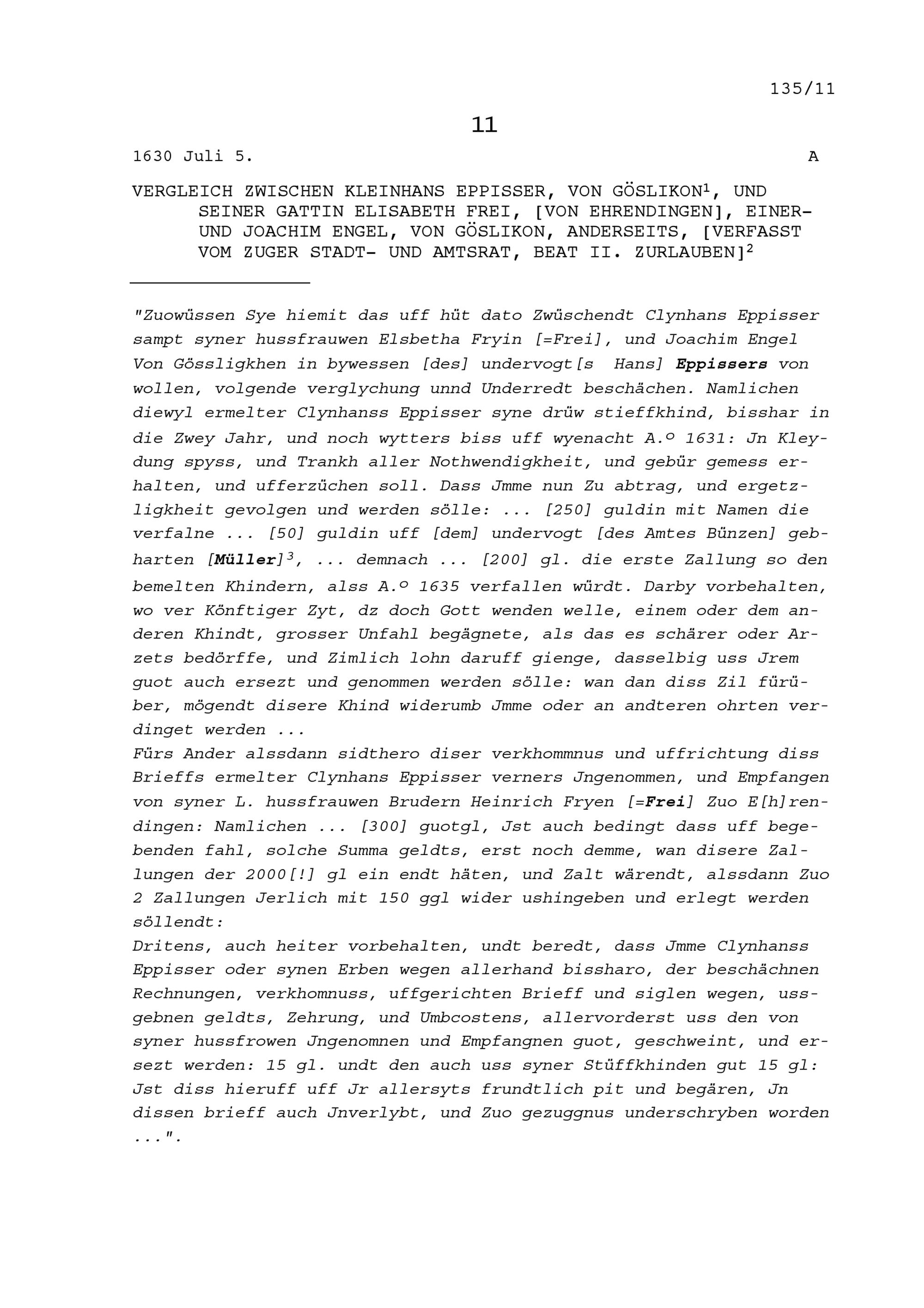 Vergleich zwischen Kleinhans Eppisser, von Göslikon, und Elisabeth Frei, seine Gattin, von Ehrendingen, einerseits und Joachim Engel, von Göslikon, anderseits, verfasst von Beat II. Zurlauben, Stadt- und Amtrat Zug