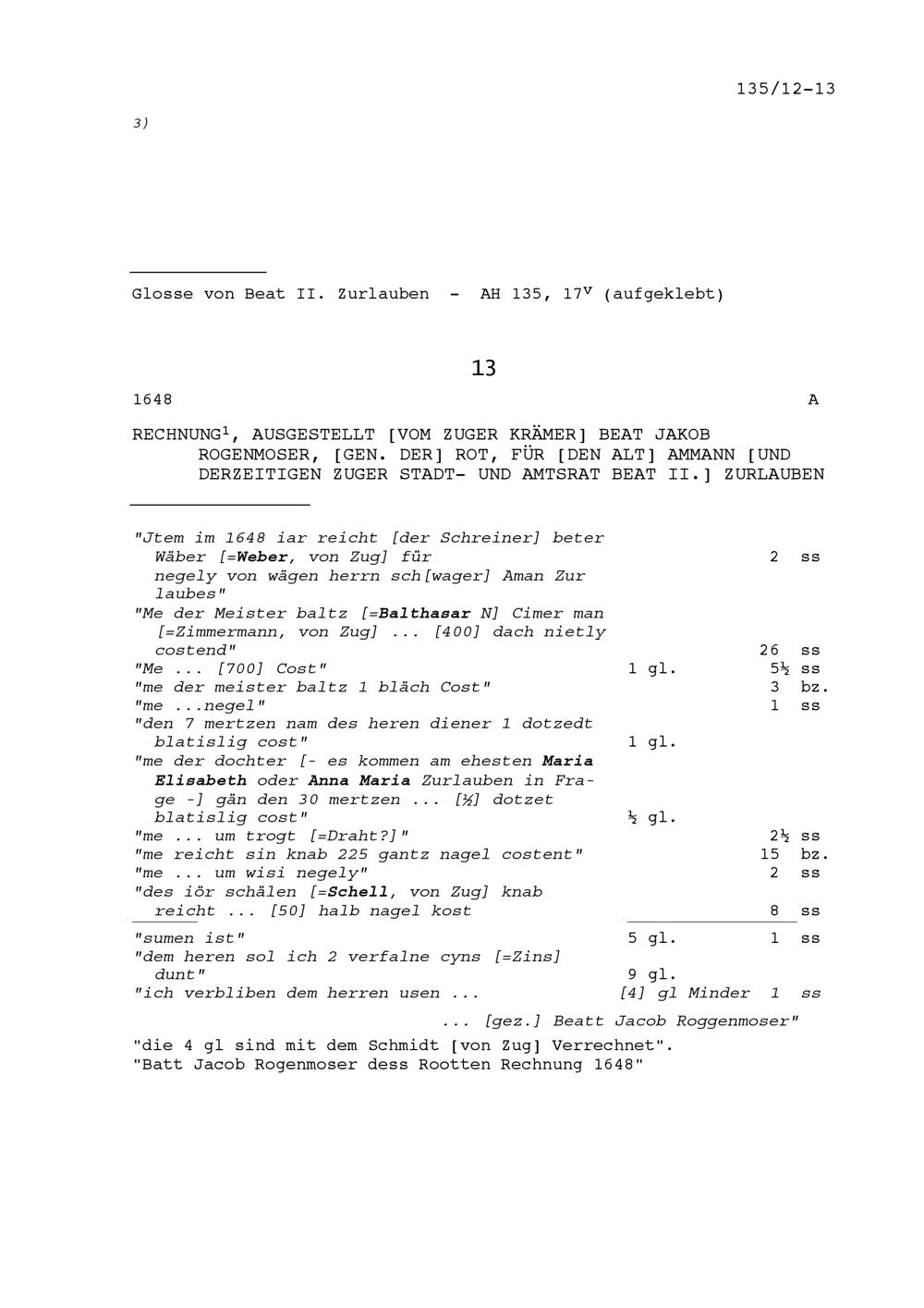 Rechnung für Beat II. Zurlauben, Altammann und Stadt- und Amtrat Zug, ausgestellt...