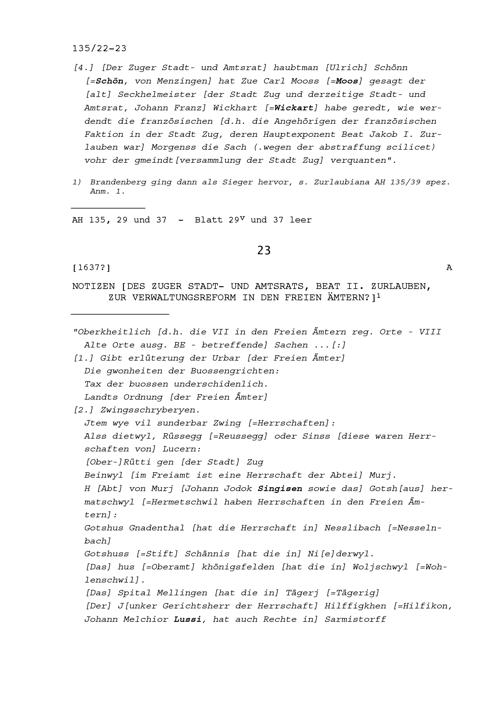 Notiz von Beat II. Zurlauben, Stadt- und Amtrat Zug, zur Verwaltungsreform in den...