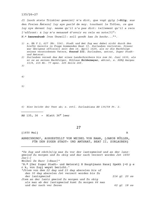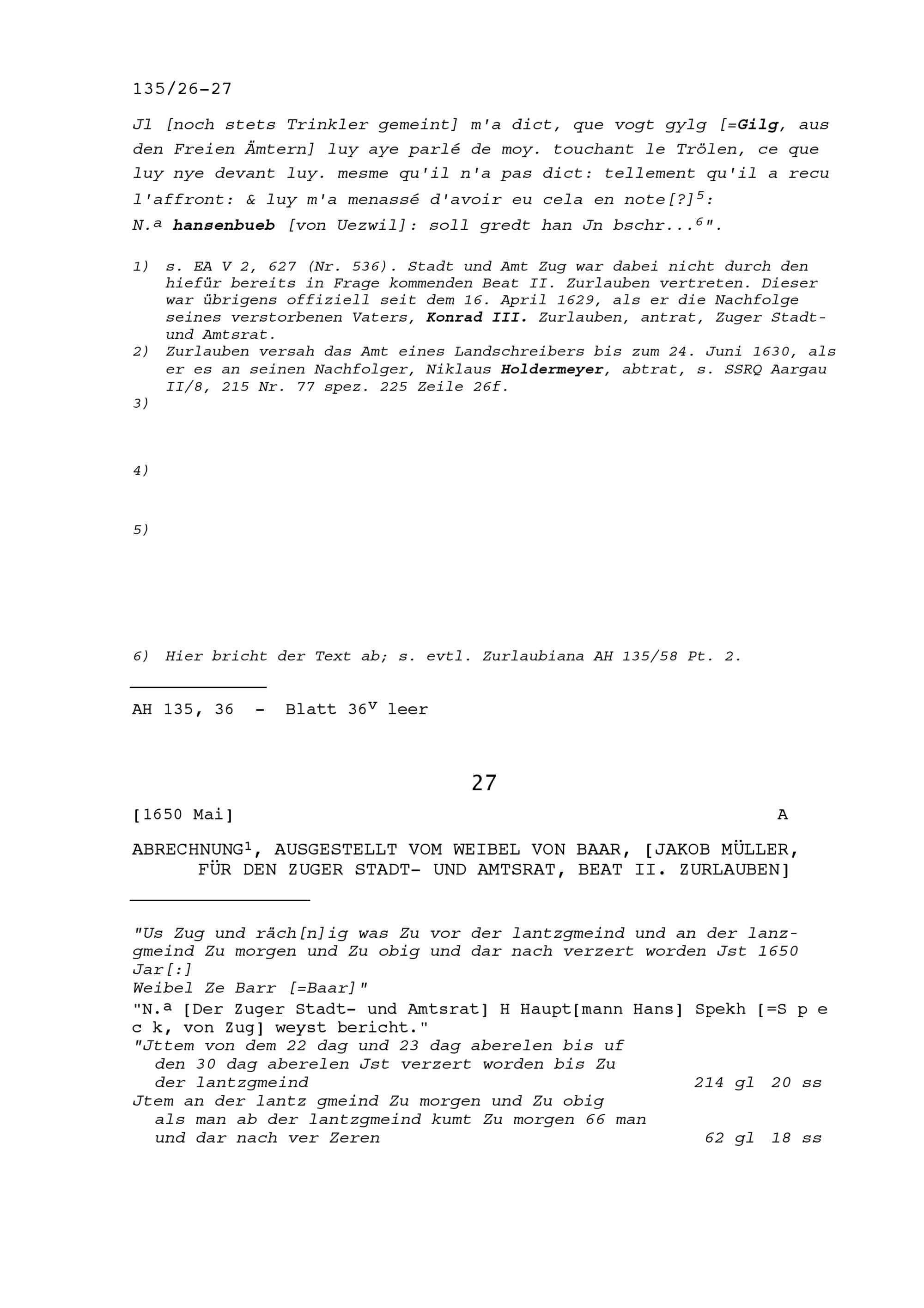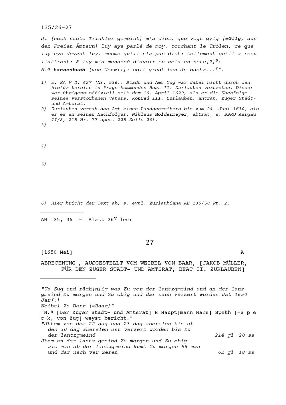 Abrechnung für Beat II. Zurlauben, Stadt- und Amtrat Zug, ausgestellt von Jakob Müller, Weibel von Baar
