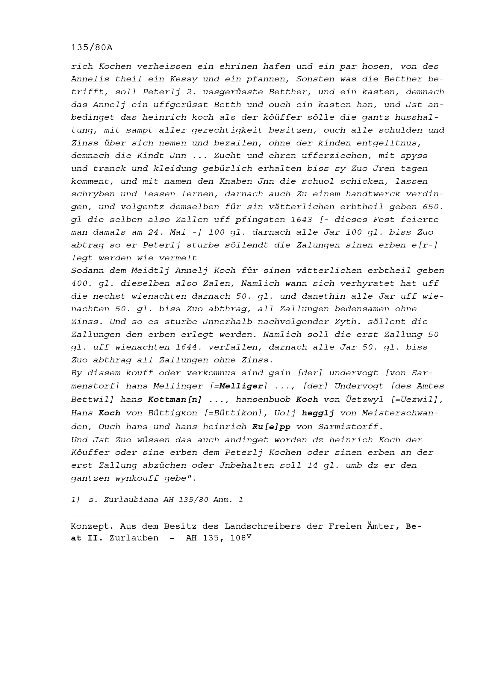 Vereinbarung bezüglich der von Peter Koch, selig, hinterlassenen Kinder Peter Koch und Anna Koch, alle von Sarmenstorf, aufgezeichnet von Uriel Seiwitt, Landschreibersubstitut der Freien Ämter