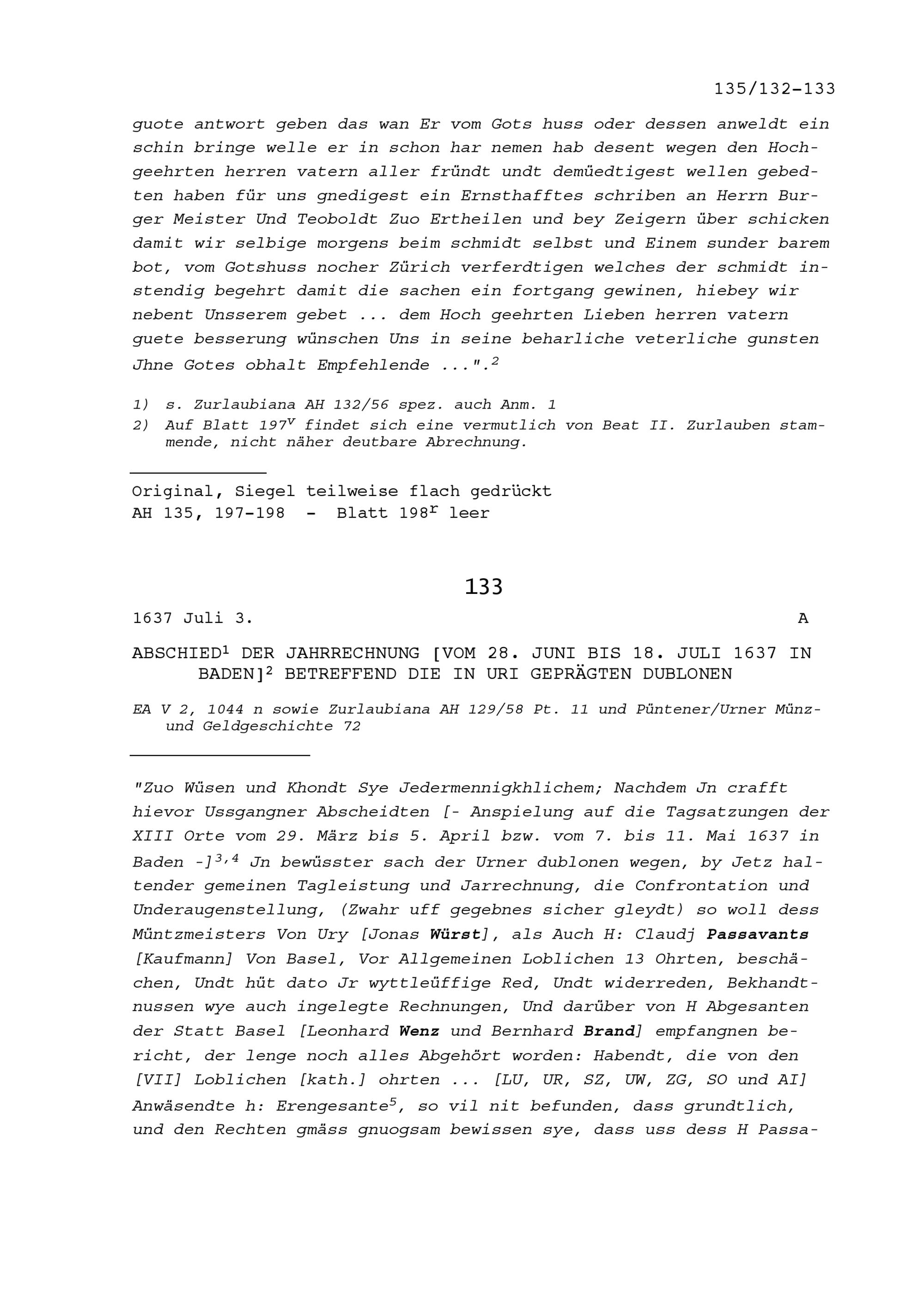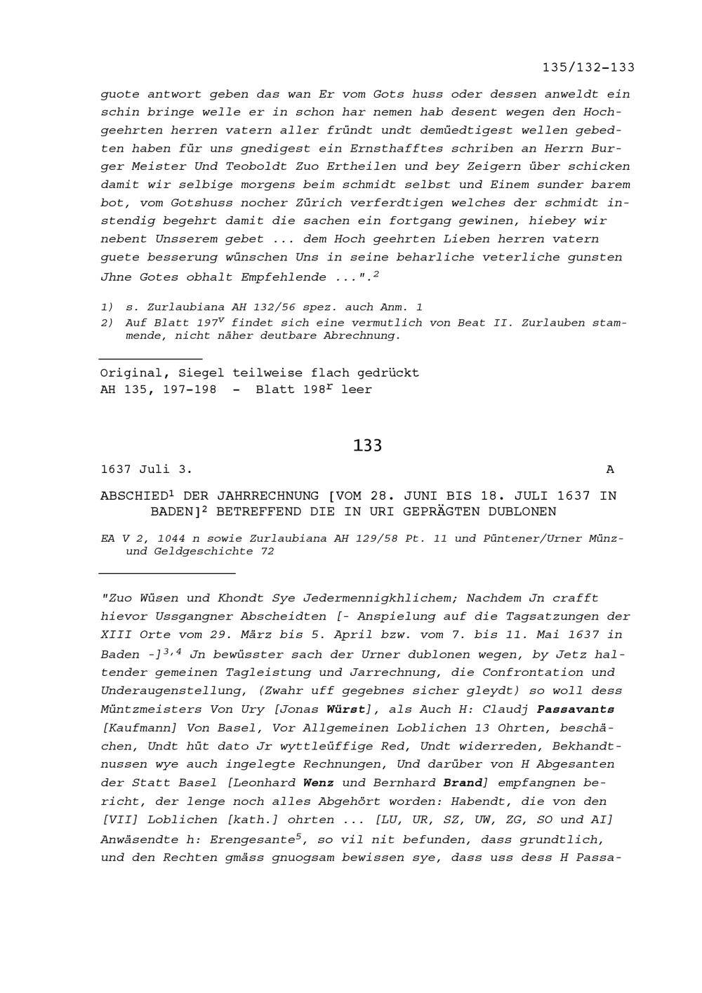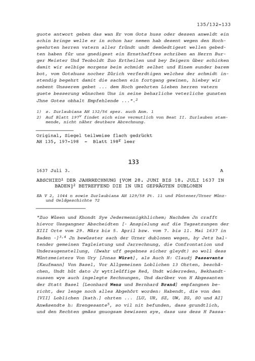 Abschied der Jahrrechnung vom 28. Juni bis 18. Juli 1637 in Baden betreffend die in Uri geprägten Dublonen